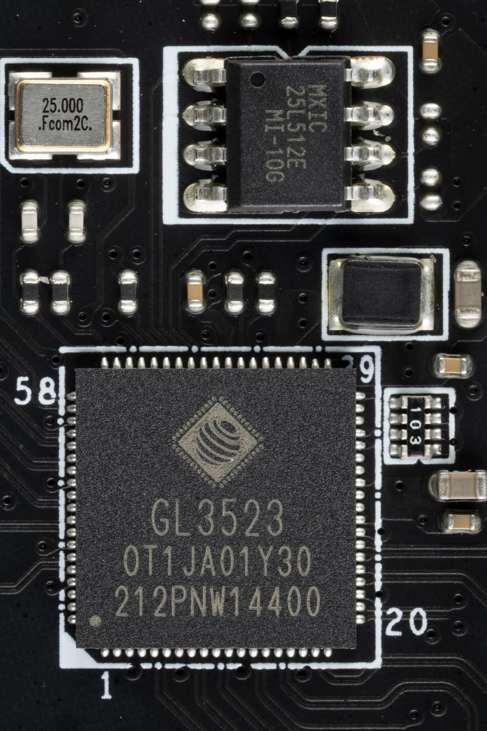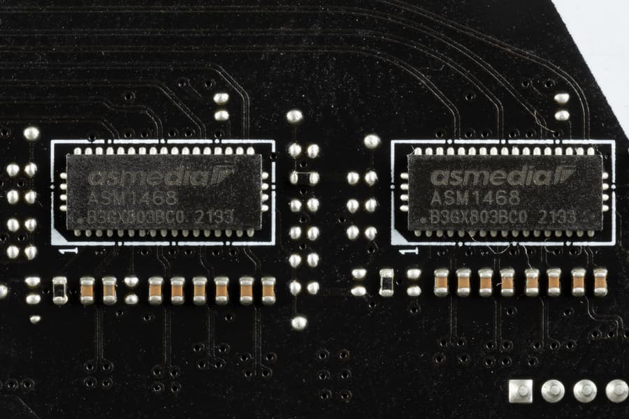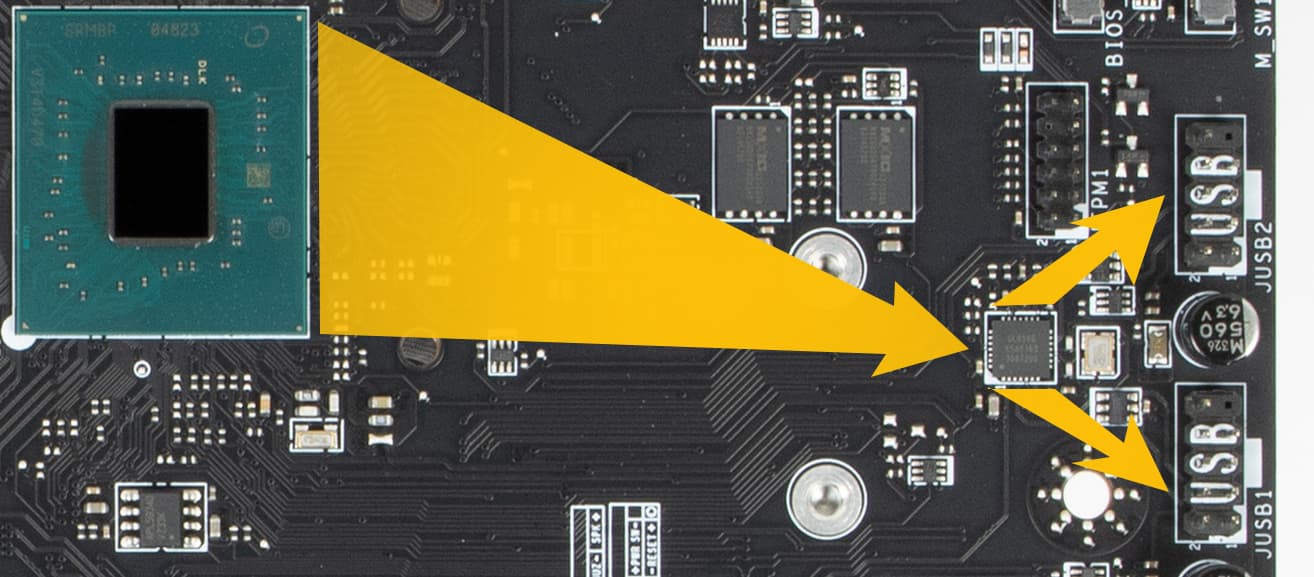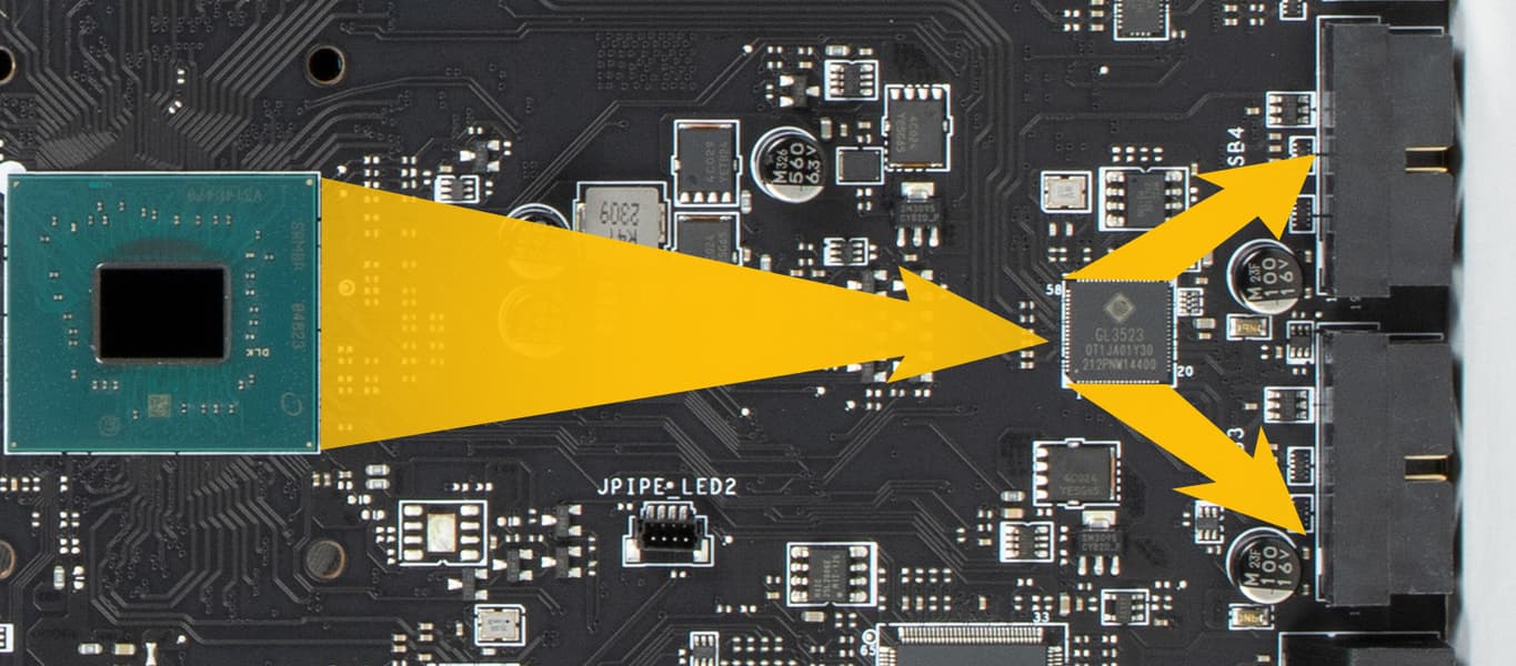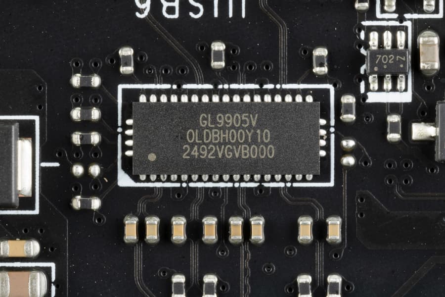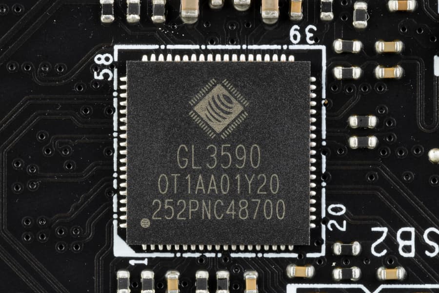 - 4 порта USB 3.2 Gen1: все реализованы через контроллер Genesys Logic GL3523 (на него потрачена 1 линия USB 2.0 от Z790) и представлены 2 внутренними разъемами на материнской плате (каждый на 2 порта);