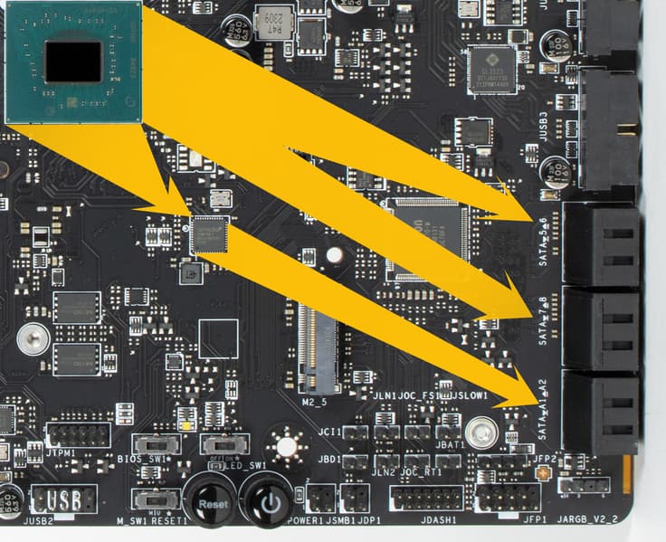 - Переключатель: или слот M.2_5 (4 линии PCIe 3.0), или порты SATA_5/6/7/8: максимум 4 линии PCIe 3.0;
