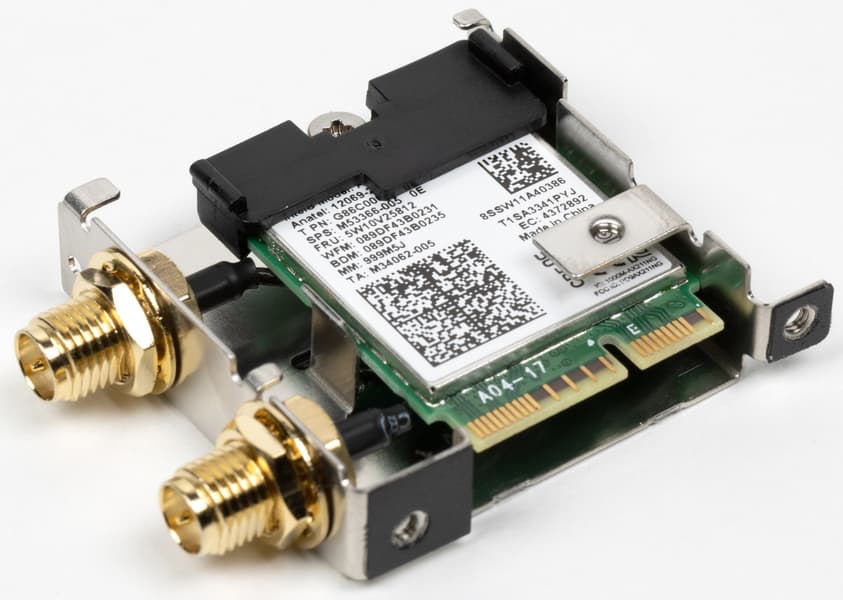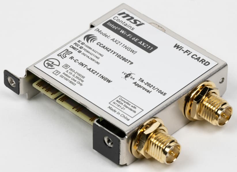 Имеется и комплексный беспроводной адаптер на контроллере Intel AX-211NGW, через который реализованы Wi-Fi 6E (802.11a/b/g/n/ac/ax) и Bluetooth 5.2. Он установлен в слот M.2 (E-key), и его разъемы для привинчивания выносных антенн выведены на заднюю панель.