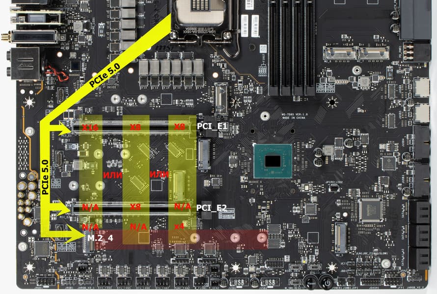 Разумеется, при таком обширном наборе слотов M.2 не обойтись без деления ресурсов между ними. Выше я уже говорил про слот M.2_4, который получает данные от процессора, причем версии PCIe 5.0, деля линии со слотом PCIe x16_2, при этом следует учитывать, что у процессора всего 16 линий PCIe 5.0, и при использовании слотов M.2_4 или PCIe x16_2, первый слот для видеокарты будет иметь всего 8 линий.