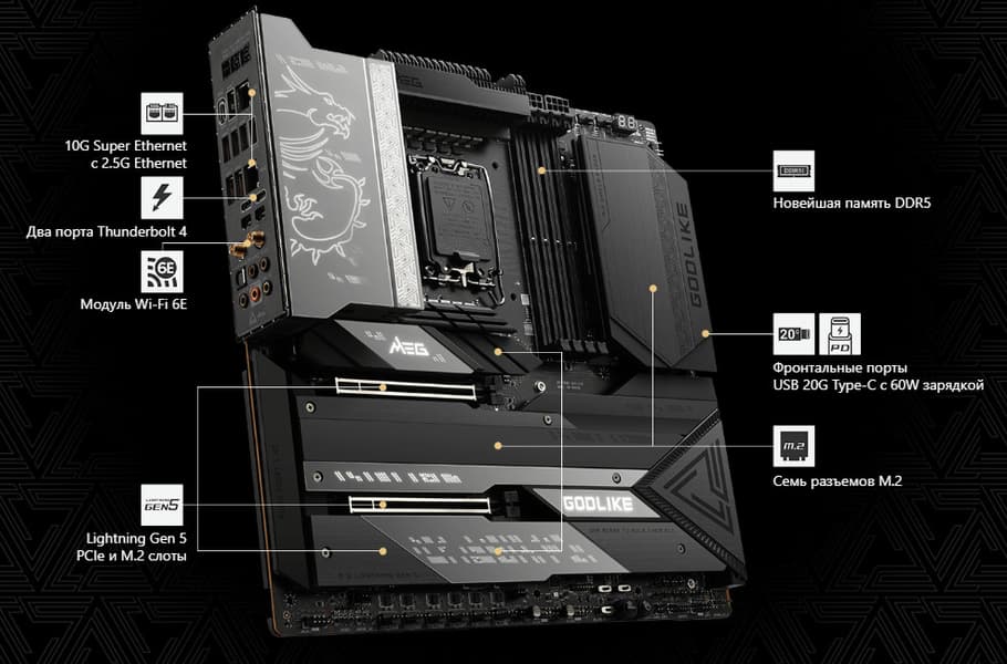 Флагманская материнская плата MSI MEG Z790 Godlike — представитель топовой серии MEG, ожидаемо очень дорогой (примерная стоимость на момент публикации обзора — около 110 тысяч рублей). Это крайне навороченная плата с поддержкой 12/13/14-го поколений процессоров Intel Core, созданная для хардкорных геймеров и энтузиастов-оверклокеров, готовых заплатить безумные с точки зрения обычного покупателя деньги за самое топовое «железо».