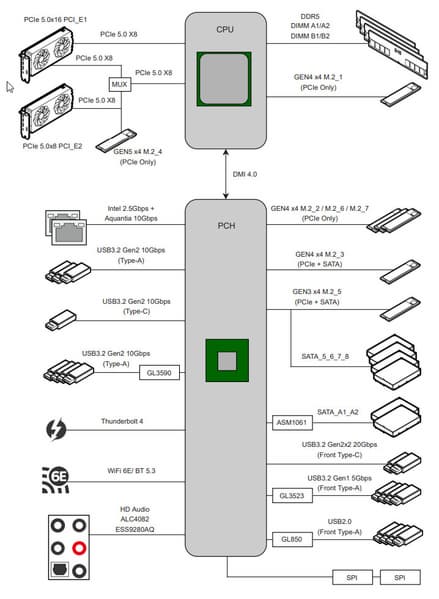 Процессоры Intel Core 14/13/12-го поколений (совместимые с сокетом LGA1700 и поддерживаемые Z790) имеют 20 линий ввода-вывода (16 PCIe 5.0, 4 PCIe 4.0), не имеют USB и SATA портов. При этом взаимодействие с Z790 идет по особому каналу Digital Media Interface 4.0 (DMI 4.0 x8). Все PCIe линии процессора идут на слоты расширения PCIe и порт М.2. Serial Peripheral Interface (SPI) используется для взаимодействия с системой UEFI/BIOS, а шина Low Pin Count (LPC) — для связи с устройствами ввода/вывода, не требующими высокой пропускной способности (контроллерами вентиляторов, TPM, старой периферии).