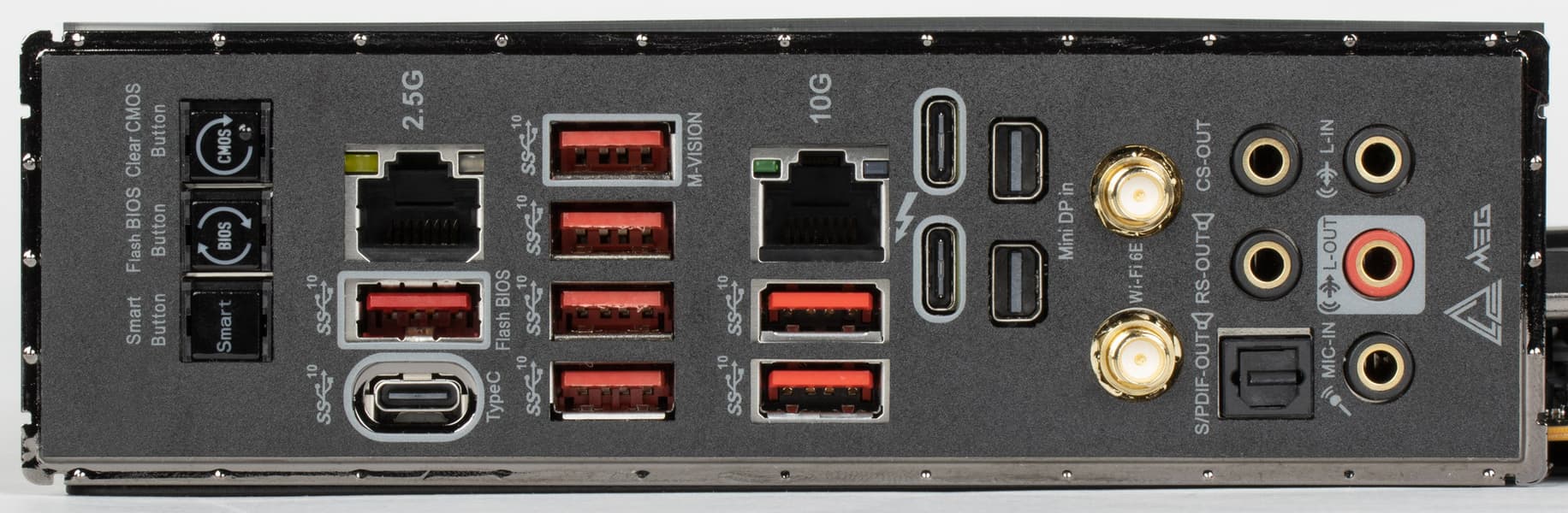 | Разъемы на задней панели | 3 × USB 3.2 Gen2 (Type-C) 7 × USB 3.2 Gen2 (Type-A) 2 × RJ-45 5 аудиоразъемов типа миниджек 1 × S/PDIF (оптический, выход) 2 × DP in (Thunderbolt4) 2 антенных разъема кнопка сброса CMOS многофункциональная кнопка Smart button кнопка перепрошивки BIOS — Flash BIOS |