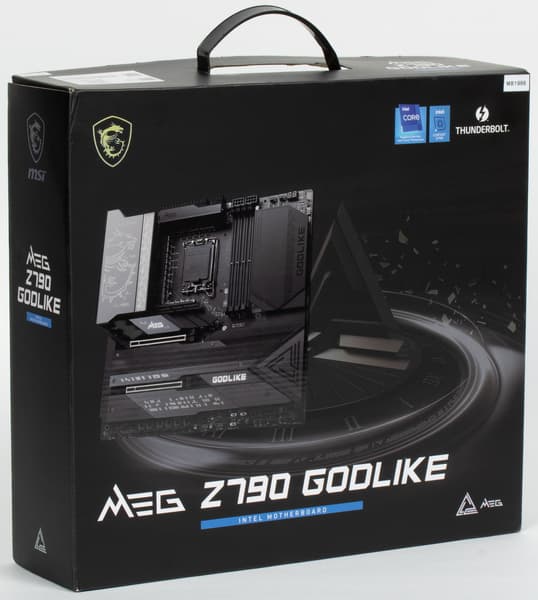 MSI MEG Z790 Godlike поставляется в традиционной толстой черной коробке фирменного дизайна серии MEG. Комплект размещен под платой в отдельном отсеке.