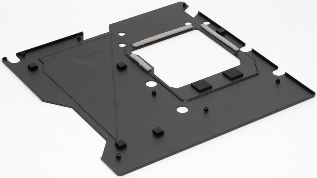 Материнская плата имеет бэкплейт, защитную пластину на оборотной стороне, которая также принимает участие в охлаждении в районе VRM через термопрокладки.