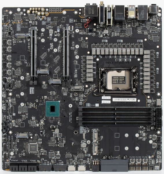 Для питания платы на ней предусмотрены 4 разъема: в дополнение к 24-контактному ATX (он на правой стороне платы (на фото — слева) здесь есть еще два 8-контактных EPS12V и один 6-контактный PCIe (для поддержки питания USB 3.2 Gen2x2 портов, через которые могут заряжаться мобильные устройства в режиме быстрой зарядки).