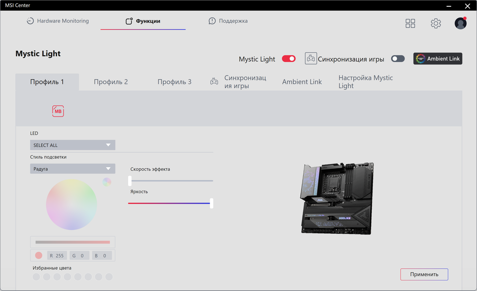 Формально имеется поддержка памяти DDR5 до 5600 МГц, однако всем хорошо известно, и производители материнских плат это активно рекламируют: через XMP-профили сейчас можно использовать частоты до 7000 и выше МГц. В частности данная плата поддерживает частоты до 7800 МГц.
