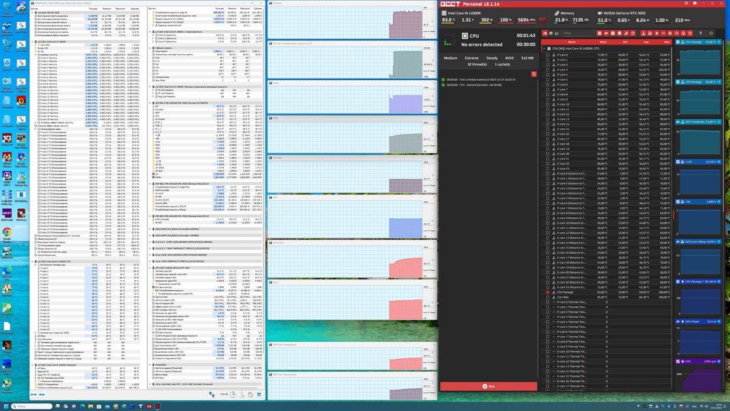 Ну что же, весьма неплохо! В режиме авторазгона мы получили 5,7 ГГц по всем P-ядрам, и 4,4 ГГц по всем Е-ядрам! Напомню, что Р-ядра — это обычные всем привычные ядра, имеющие по 2 потока каждый, «Р» — означает Performance, то есть производительные. «Е» — это энергоэффективные ядра, так называемые, малые ядра, у них по 1 потоку. В целом мы видим, что система по умолчанию, определив очень мощное питание матплаты, выставила очень приличный авторазгон. Все остальные параметры системы по нагреву компонентов были в норме. И стоит отметить, что потребление CPU уже перевалило за 300 Вт!