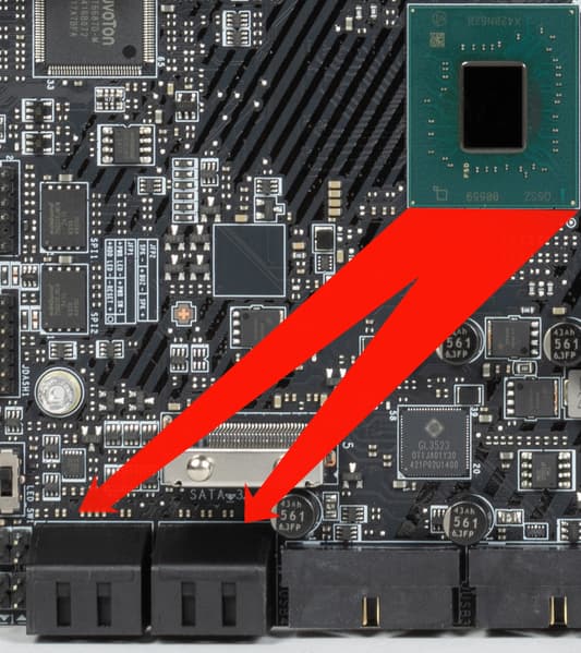 19 линий PCIe оказались занятыми, плюс 4 порта SATA. 1 линия USB 2.0 расходуется на связь с Realtek RTL4082, плюс один USB 2.0 расходуется на поддержку BT, а также контроллеры GL850G, NUC126 и другие для своих нужд используют сигнальные линии USB 2.0 и 3.2 Gen1/2. Детально об этом ниже в разделе USB-портов.
