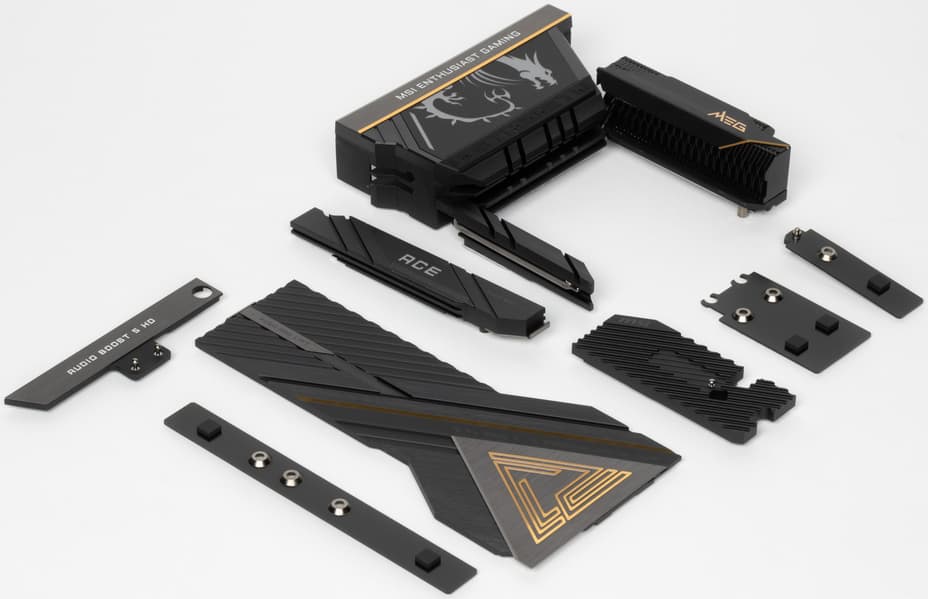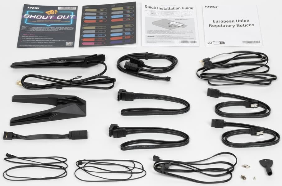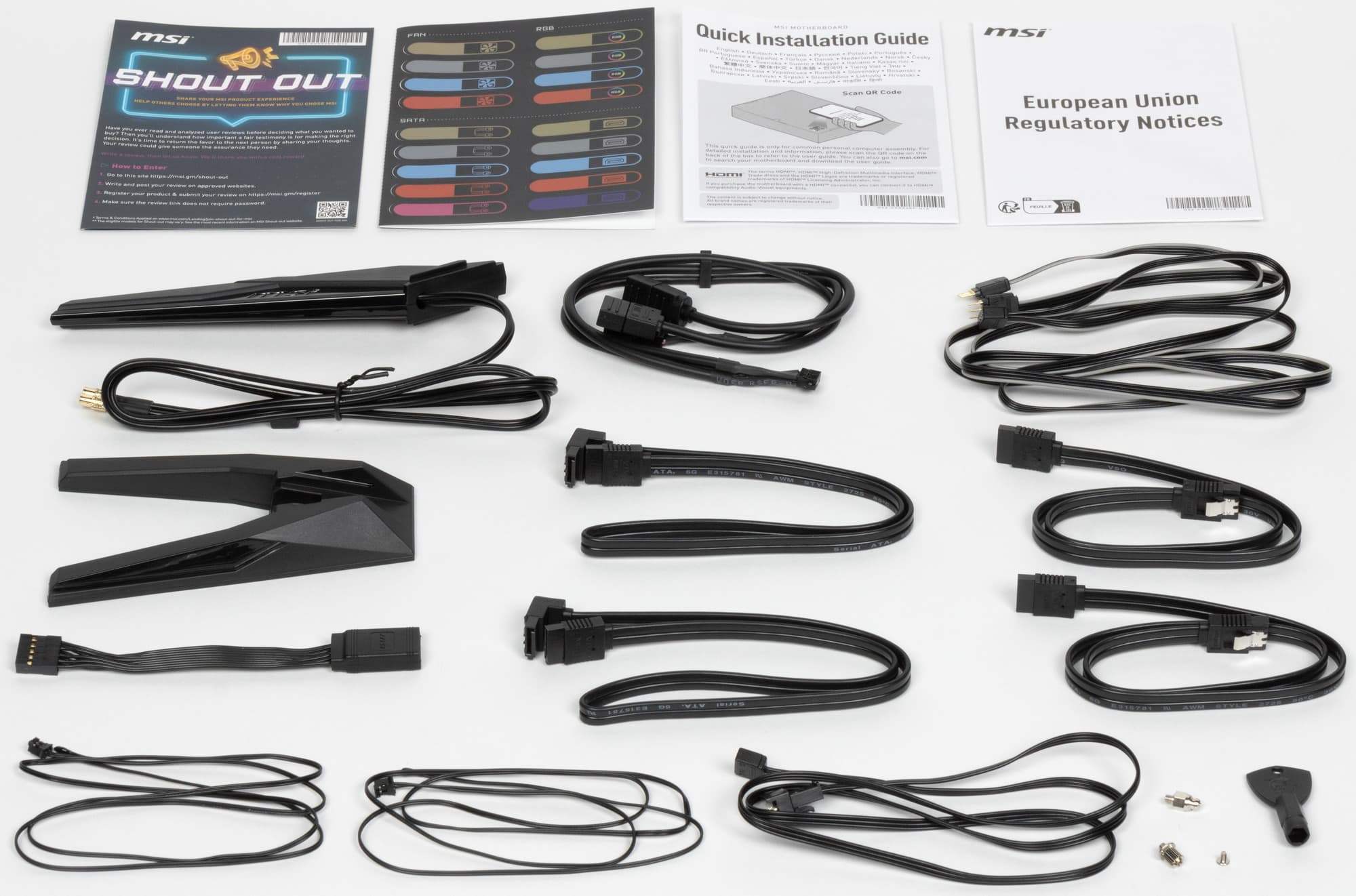 В комплект поставки кроме традиционных элементов типа краткого руководства пользователя и кабелей SATA входят: антенна встроенного Wi-Fi-модуля, фирменный адаптер для передней панели, бонусные стикеры, ключ для смены держателей в слотах M.2, адаптеры-разветвители для подключения внешней подсветки, адаптер для подключения СО от MSI через проприетарное гнездо JAF и два термодатчика.