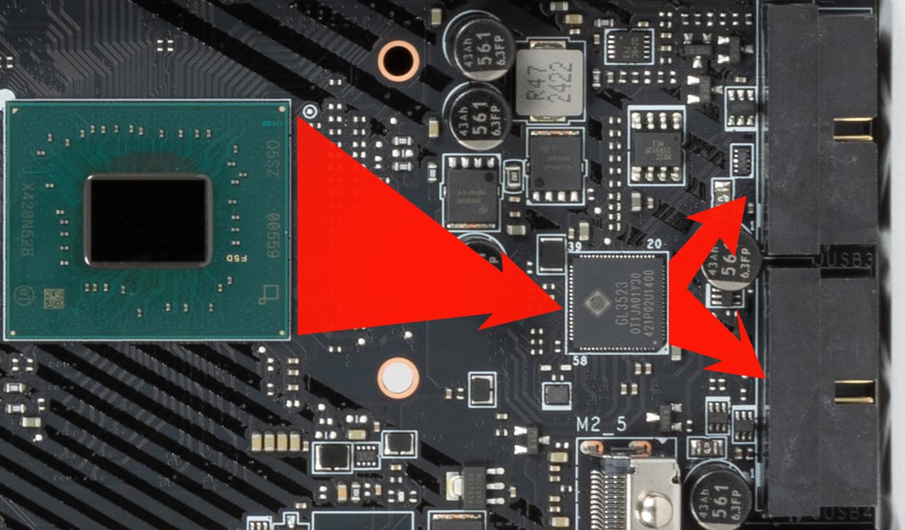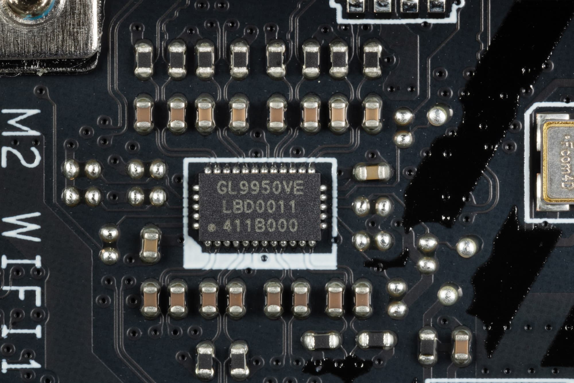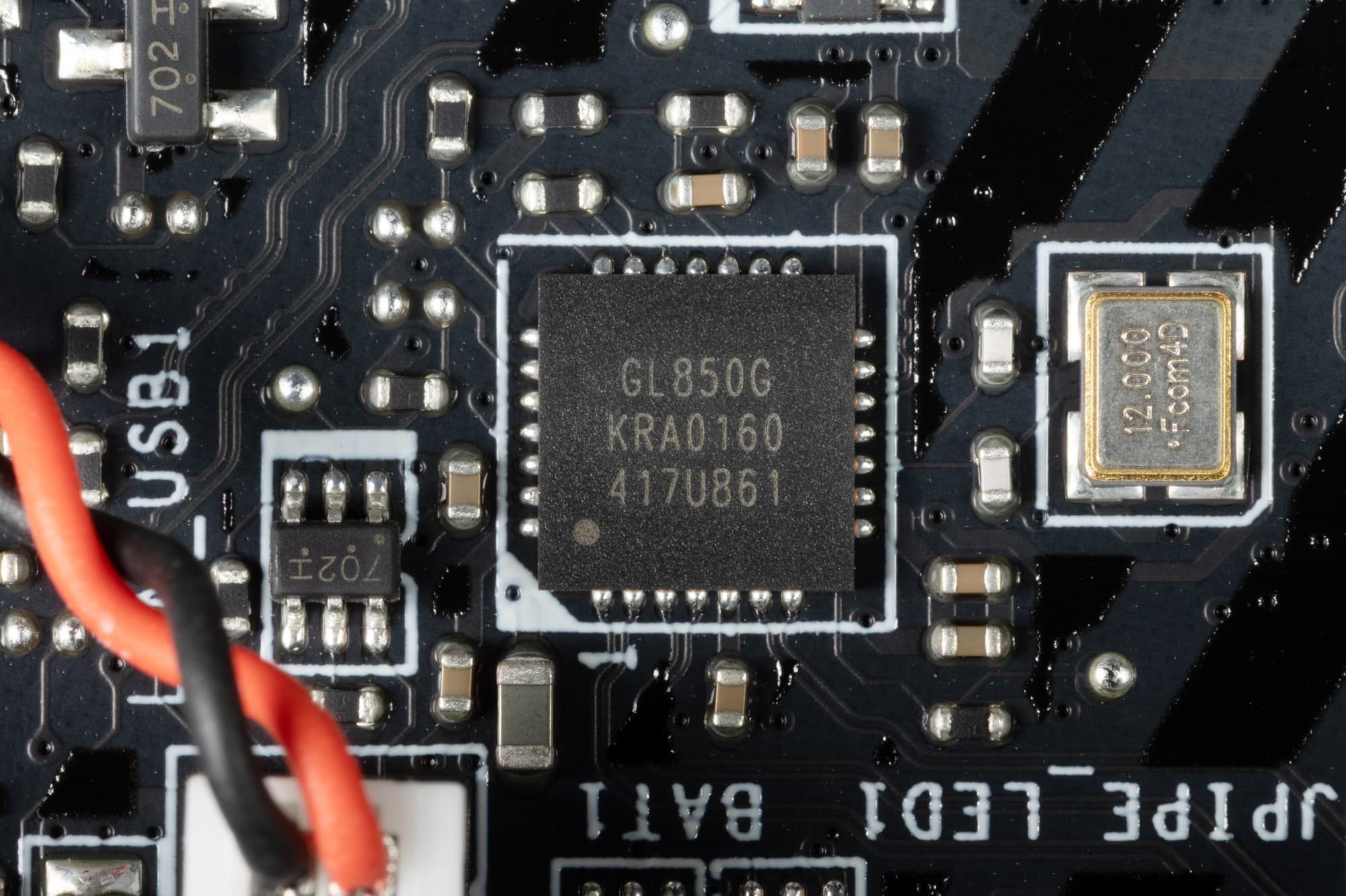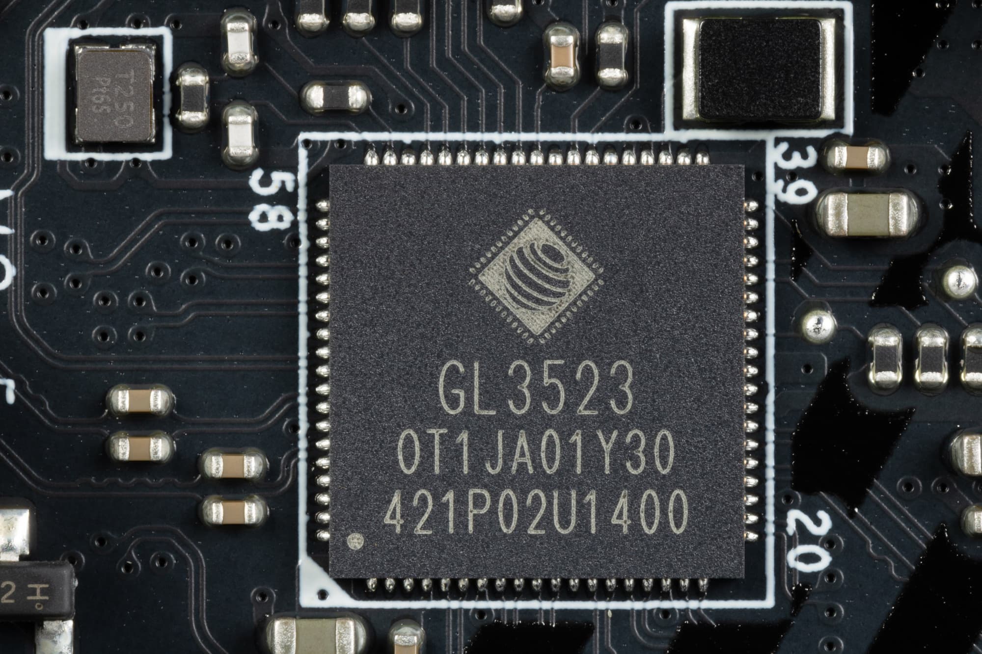 - 4 порта USB 3.2 Gen1: все реализованы через контроллер Genesys Logic GL3523 (на него потрачена 1 линия USB 3.2 Gen1 от Z890) и представлены 2 внутренними разъемами на материнской плате (каждый на 2 порта);
