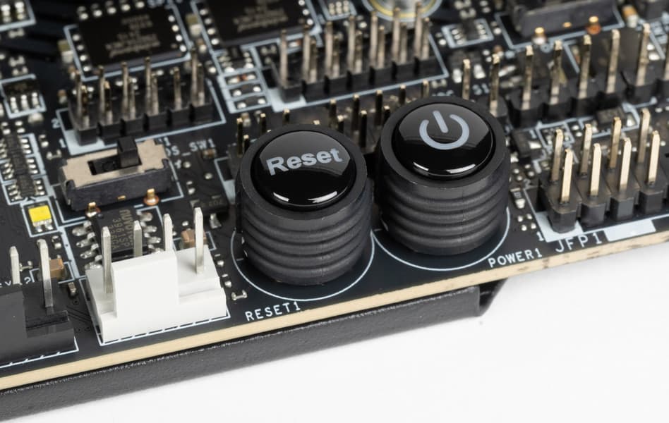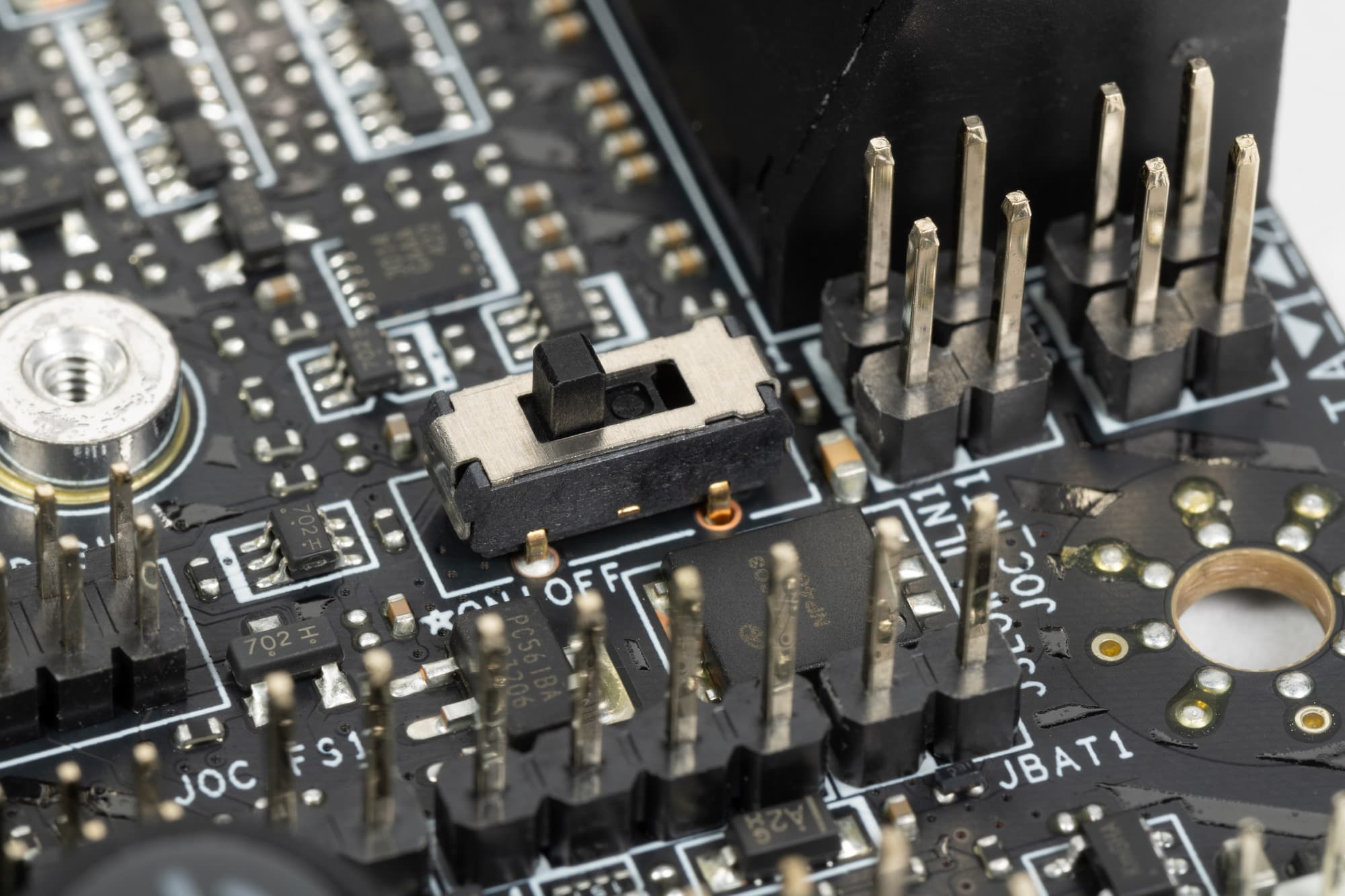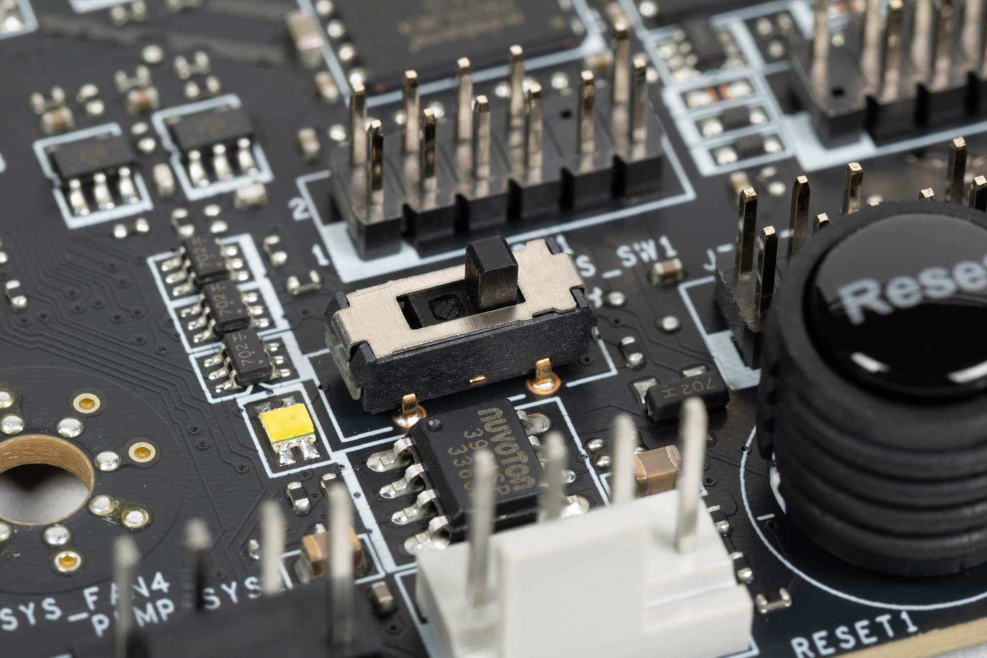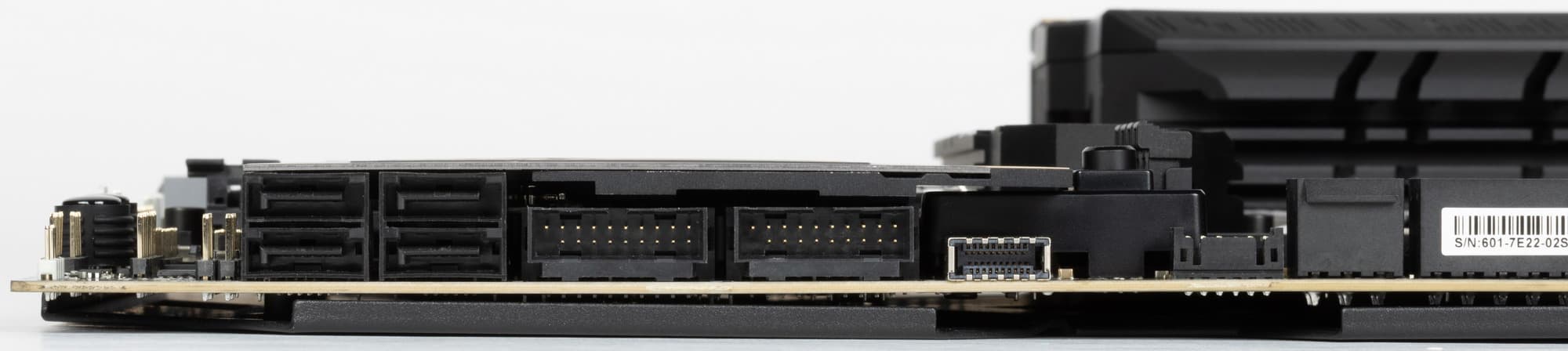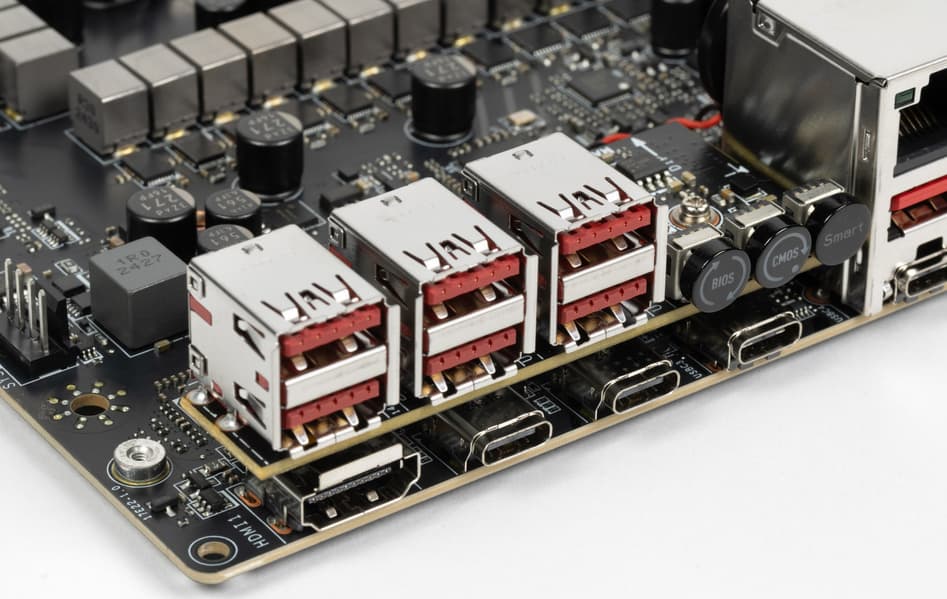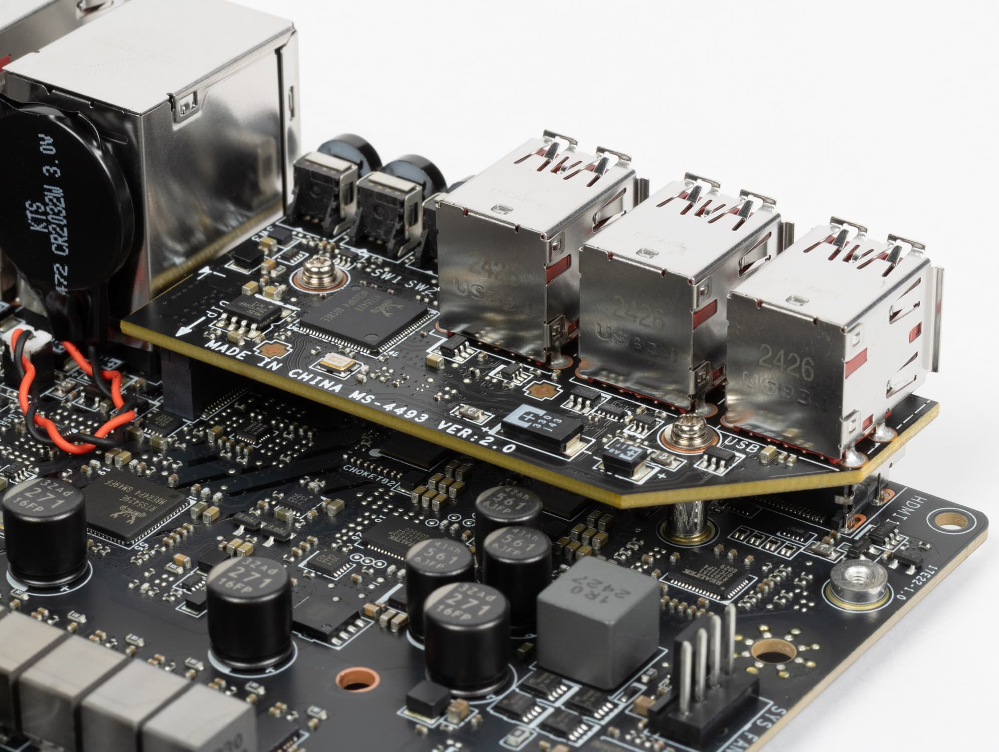 Очевидно, что задняя панель просто переполнена портами, и мы впервые видим интересную реализацию портов – в 2 «этажа». На левом верхнем углу матплаты над четырьмя портами (HDMI и три Type-C) расположена небольшая плата, несущая на себе аж 6 портов Type-A (3.2 Gen2) и три кнопки управления.