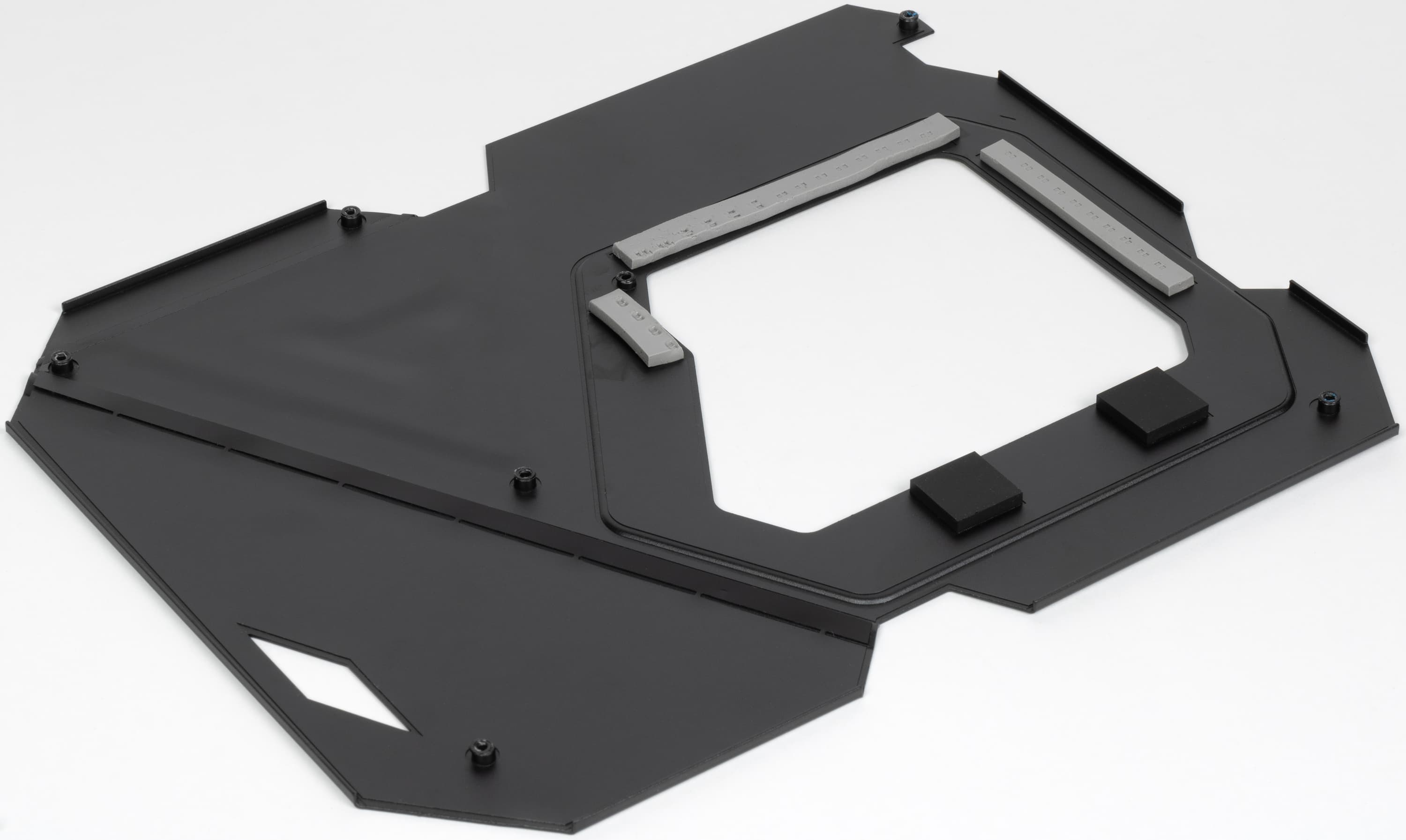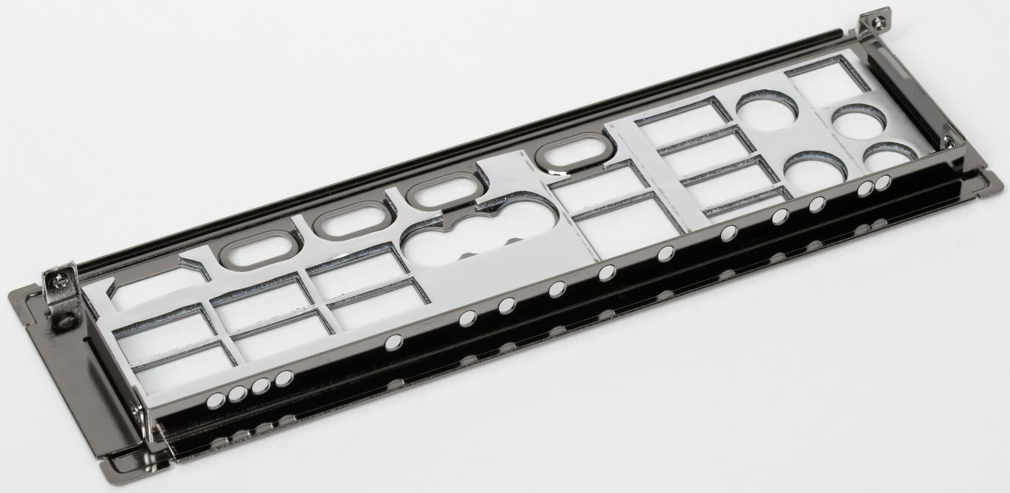 Напомню, что материнская плата имеет бэкплейт из алюминия с наноуглеродным антиэлектропроводным покрытием. Данная пластина не только защищает оборотную сторону матплаты от повреждений, служит элементом жесткости конструкции, но также участвует в охлаждении тыльной стороны платы в области VRM.