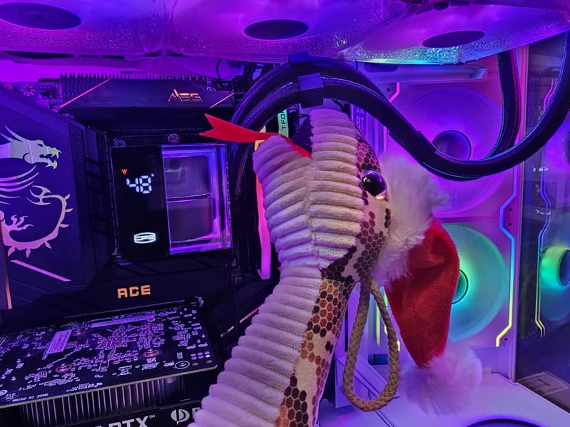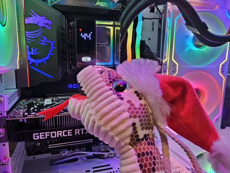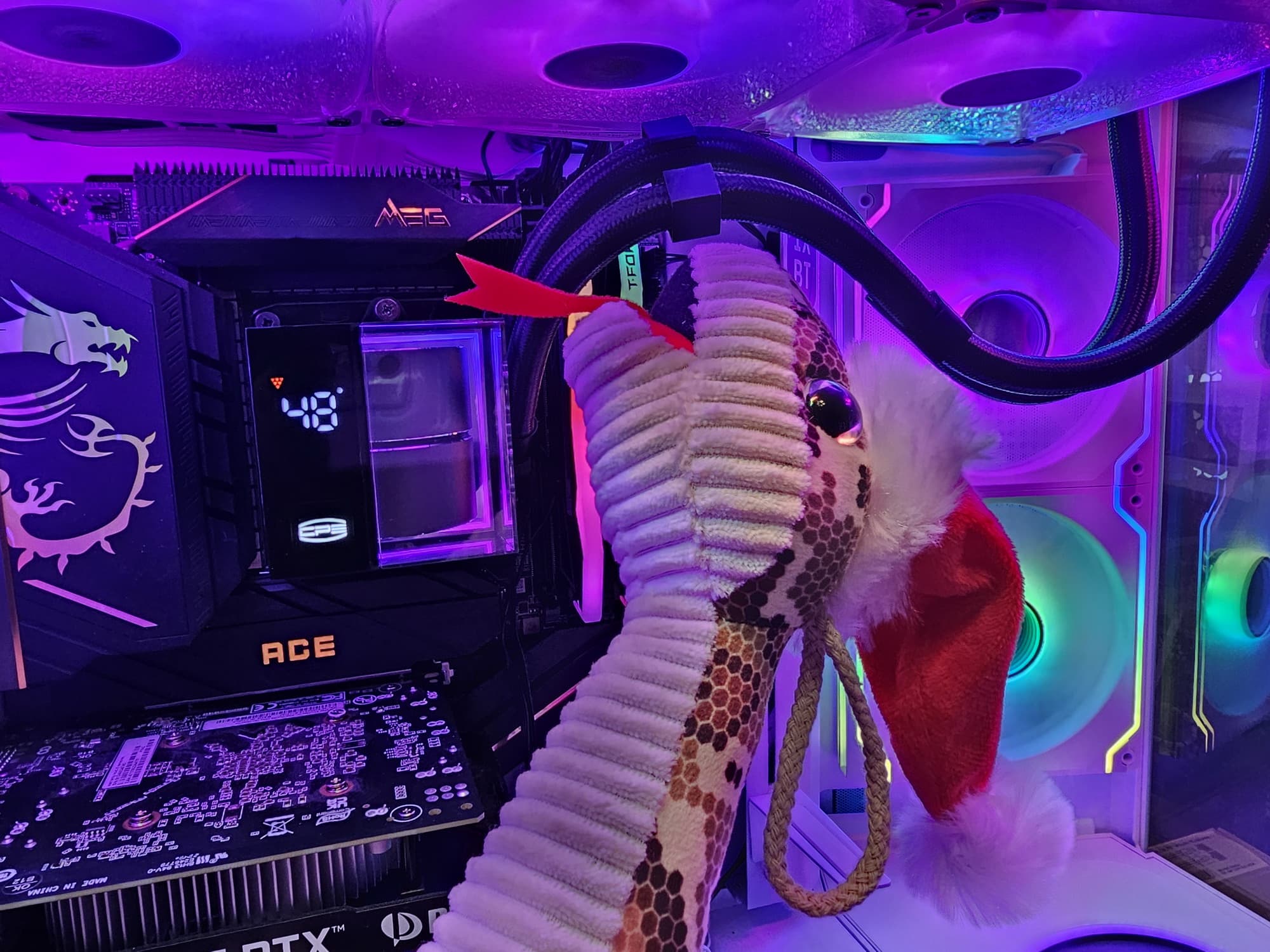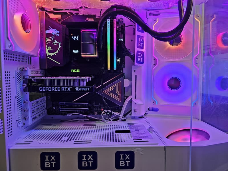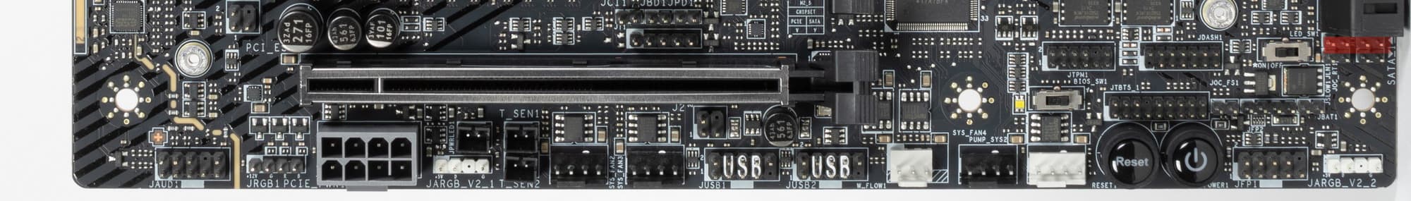 В арсенале платы также есть 4 порта SATA и 8 разъемов для вентиляторов. Система питания процессора крайне мощная, способная обеспечить работу любых совместимых процессоров с приличным запасом на разгон. Плата имеет грамотную систему охлаждения каждого потенциально греющегося элемента, включая накопители в слотах M.2 (термопрокладки для охлаждения накопителей есть с обеих сторон). Сетевые возможности включают максимально скоростной на сегодня проводной контроллер 10 Гбит/с и один самый современный беспроводной — Wi-Fi 7 + Bluetooth 5.4. В числе плюсов платы можно упомянуть неплохую стильную подсветку, а также широкие возможности для подключения дополнительных RGB-устройств.