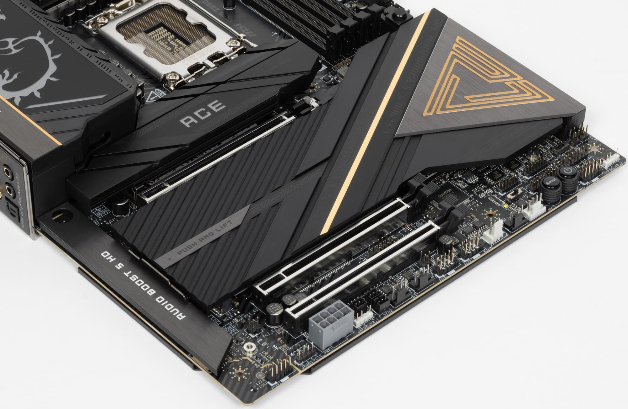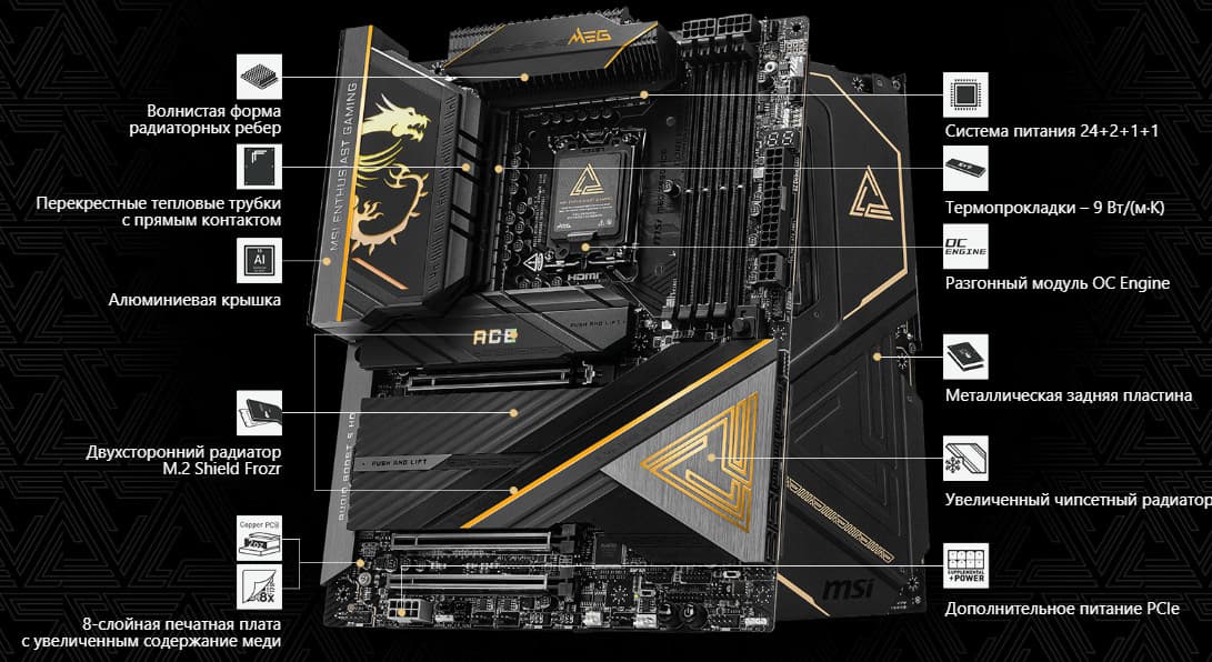 MSI MEG Z890 Ace — очень мощная по системе питания, насыщенная всевозможными слотами и разъемами и, разумеется, очень недешевая материнская плата на базе последнего чипсета Intel Z890. Плата наделена многими аппаратными возможностями в помощь оверклокерам. Это почти флагман, ее стоимость на момент подготовки обзора составляла около 100 тысяч рублей.