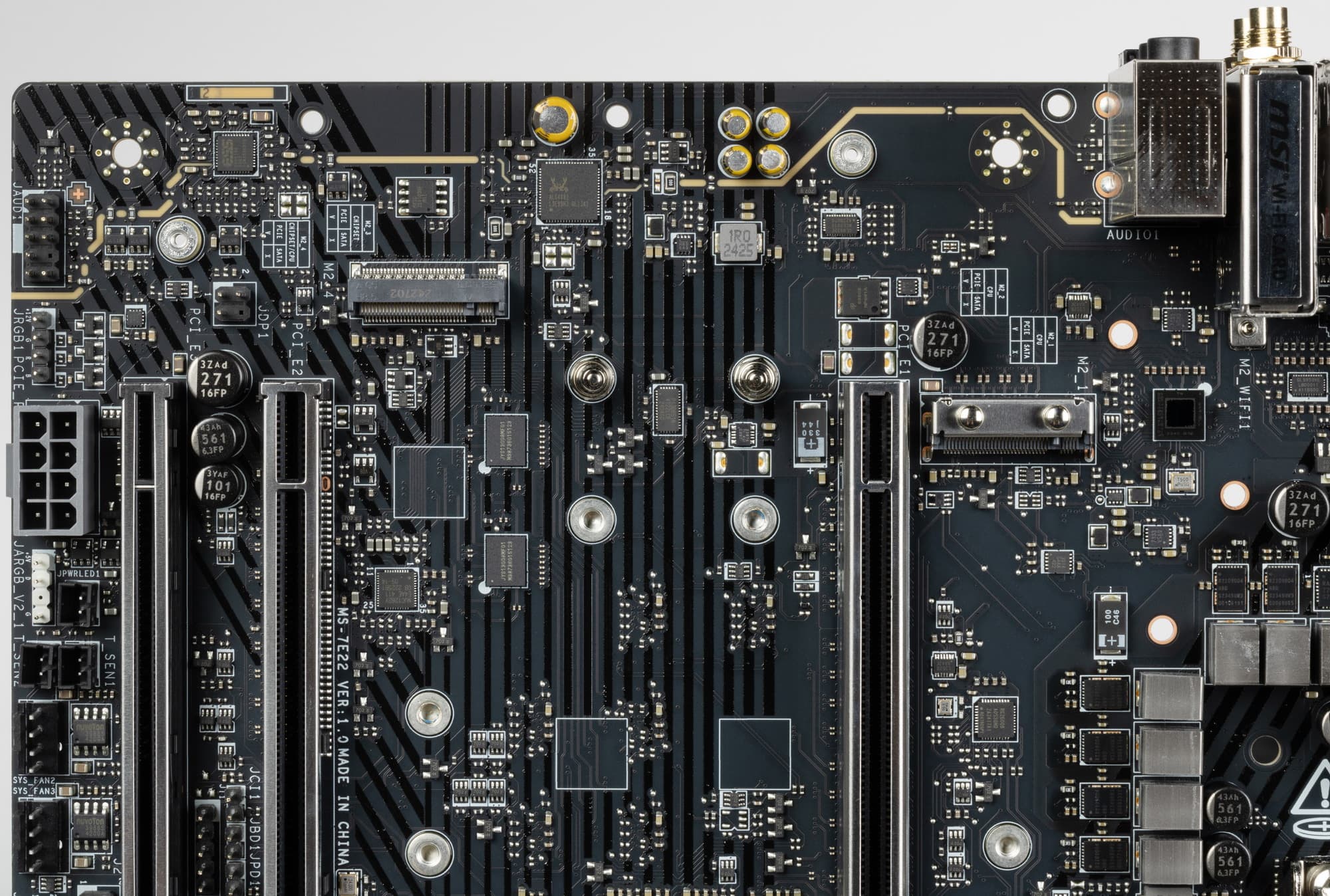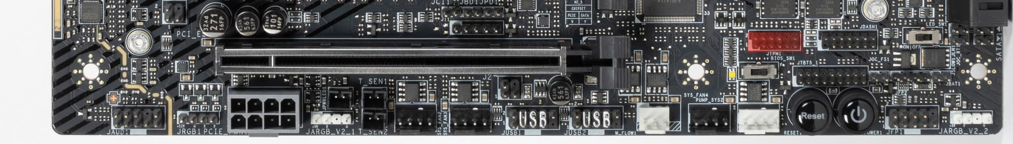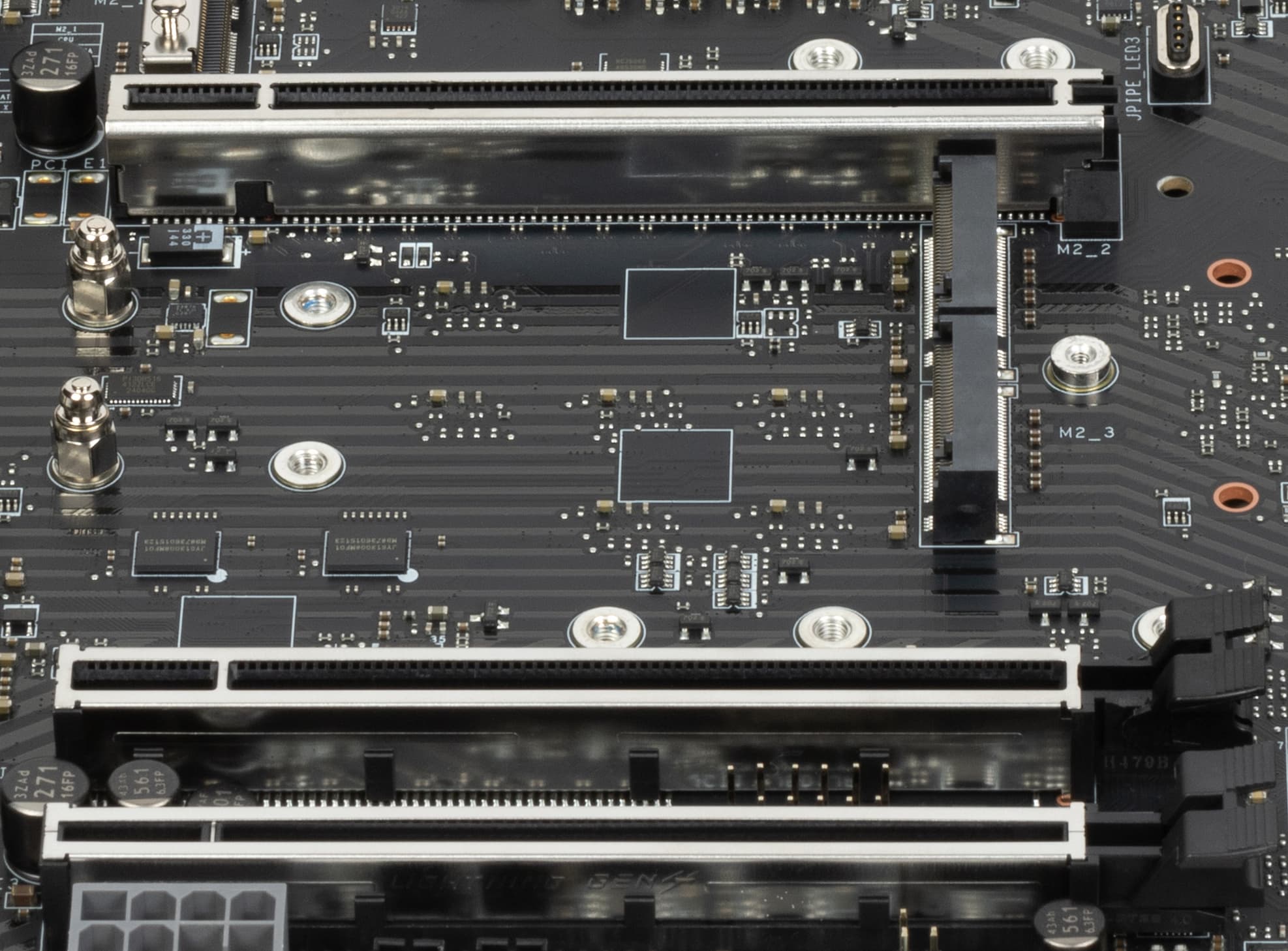 Всего на плате есть 3 слота: два PCIe x16 (PCI_E1/2 для видеокарт или других устройств) и третий «длинный» PCIe x16 (PCI_E3, но фактически имеющий 4 линии PCIe 4.0).