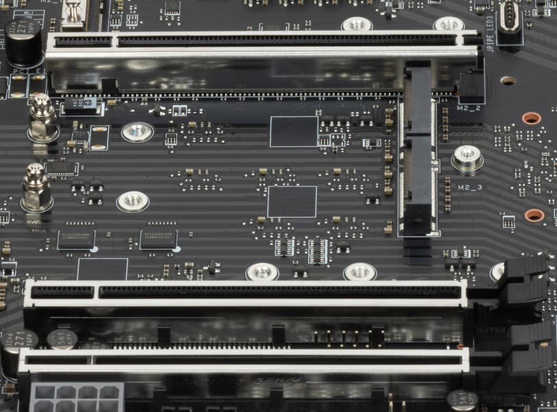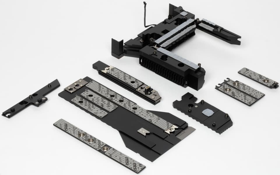 Все M.2 слоты имеют радиаторы. Верхний M.2_1 обладает отдельным радиатором, когда как остальные все слоты M.2 имеют общий радиатор. Также все слоты M.2 кроме верхних радиаторов еще имеют радиаторы для охлаждения тыльной стороны модулей.