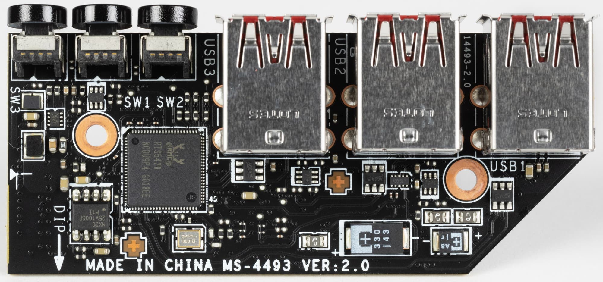 При этом один из хабов USB 3.2 Gen2 – Realtek RTS5420 расположен на этой дополнительной карте, обеспечивая работу 4х портов USB 3.2 Gen2.