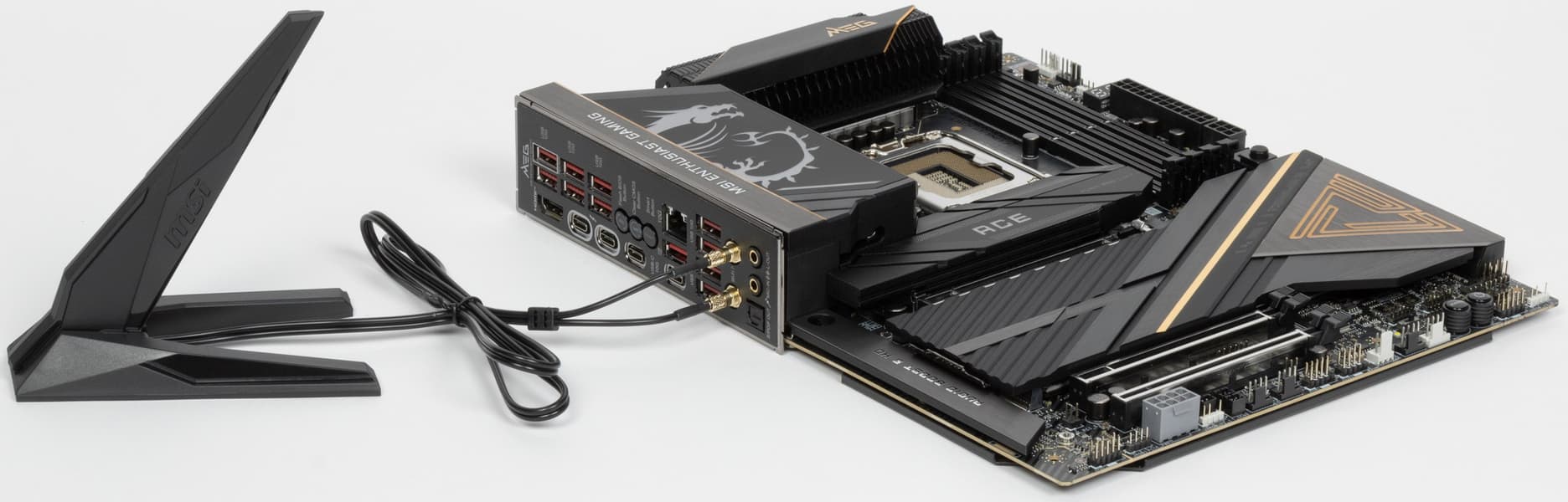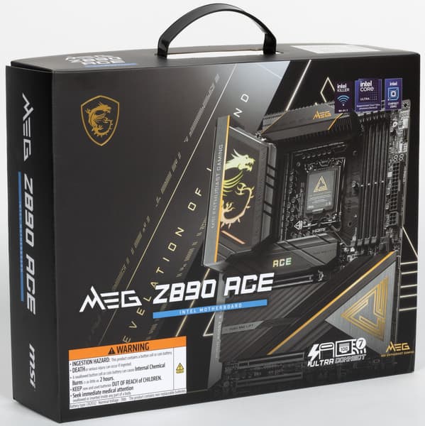 MSI MEG Z890 Ace поставляется в коробке фирменного дизайна MSI с ручкой для переноски. Комплект размещен под платой в отдельном отсеке.