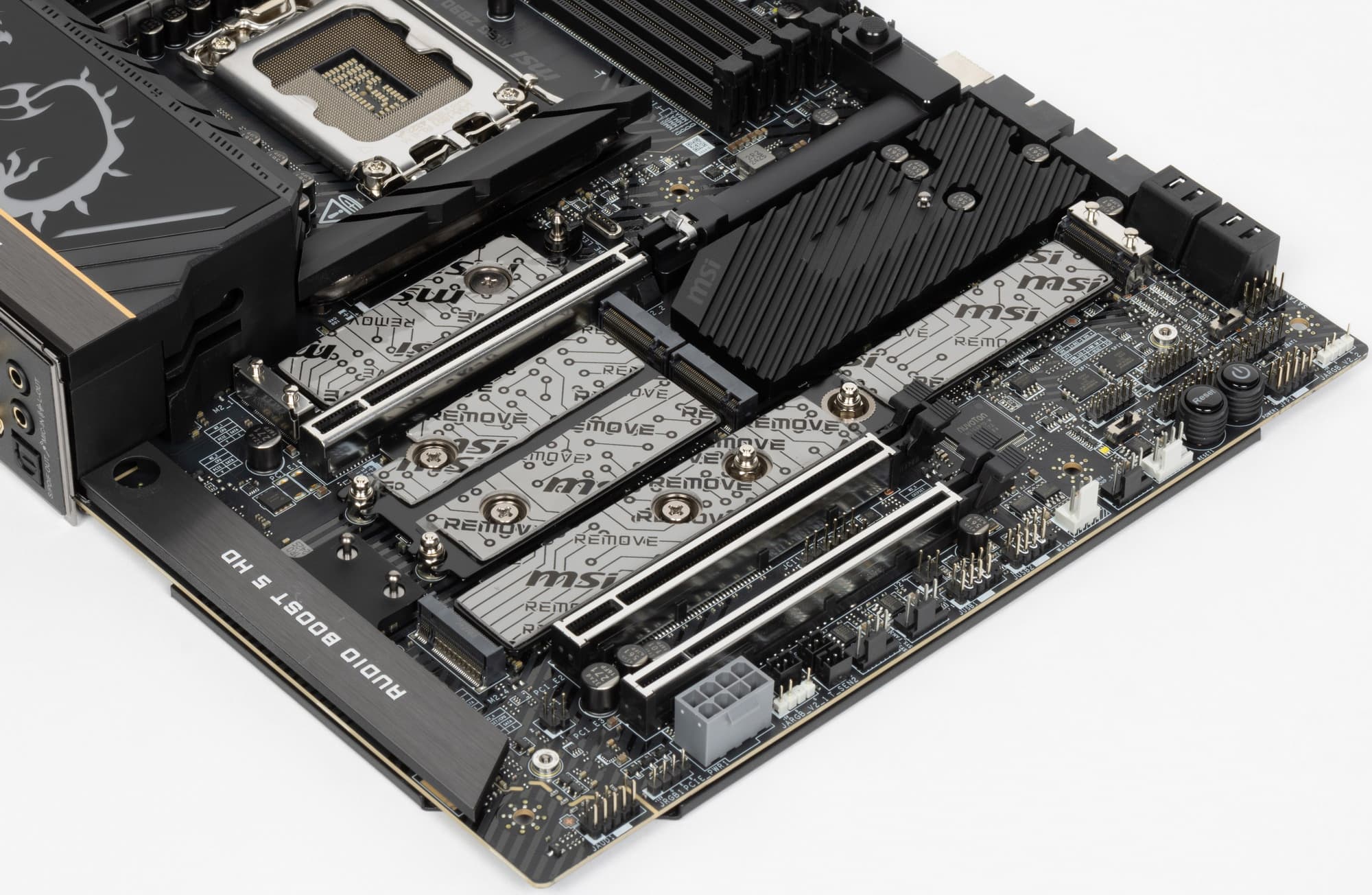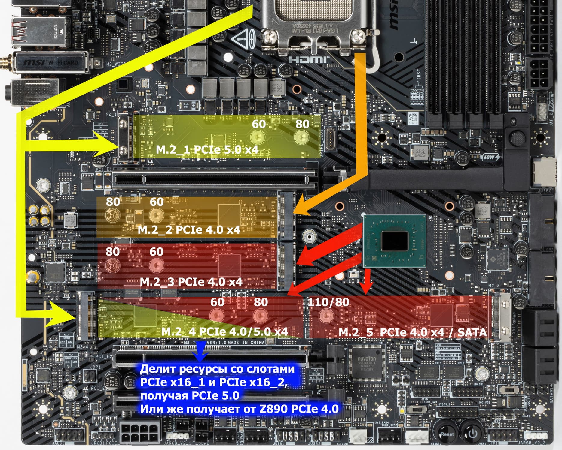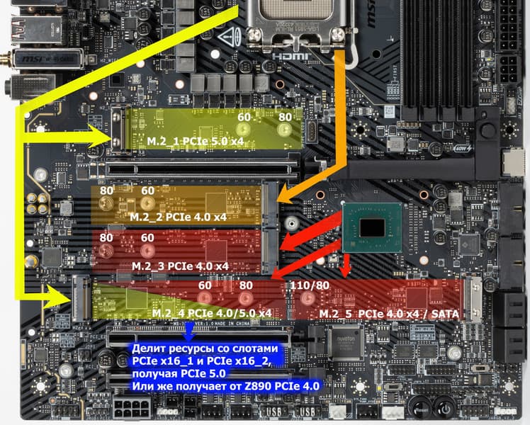 Третий и пятый слоты M.2 (M.2_3, M.2_5) получают данные от чипсета Z890, а первые два — от CPU, при этом M.2_1 получает PCIe 5.0, а M.2_2 получает от процессора PCIe 4.0. При этом слот M.2_4 может получать данные как от процессора (PCIe 5.0 x4), деля ресурсы со слотами PCIe x16 (я выше уже рассказывал), так и от чипсета (PCIe 4.0 x4), когда деление ресурсов со слотами PCIe x16 невозможно.