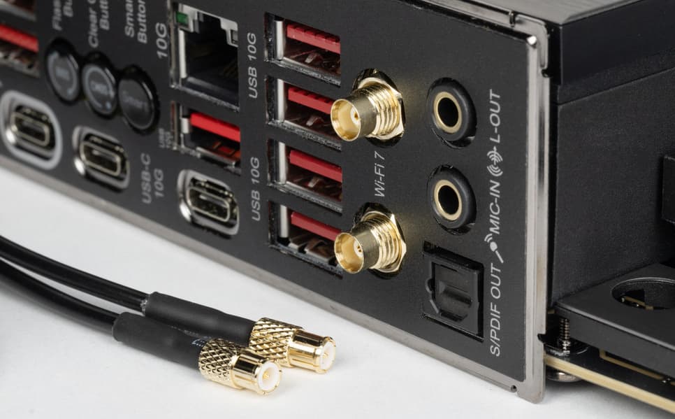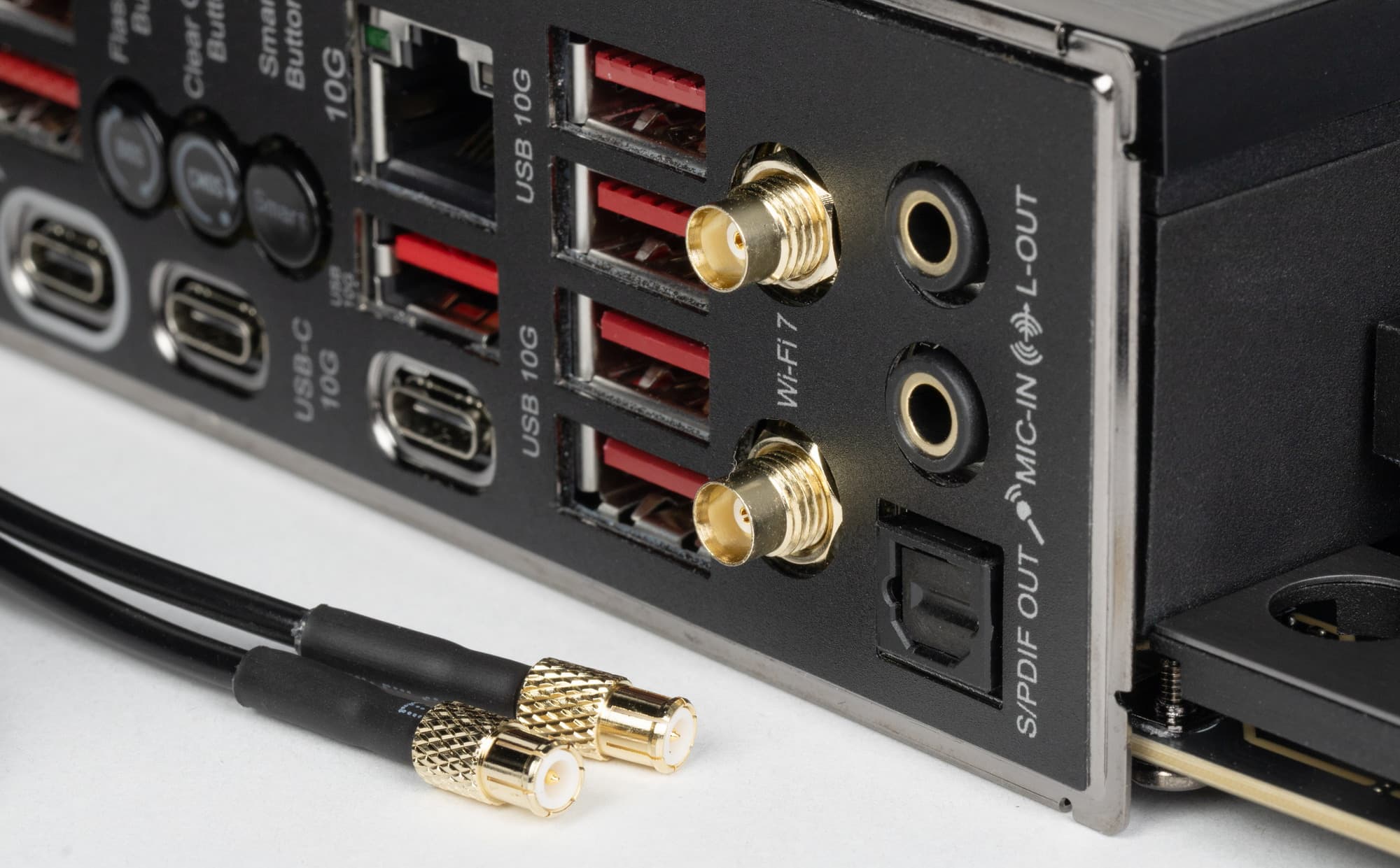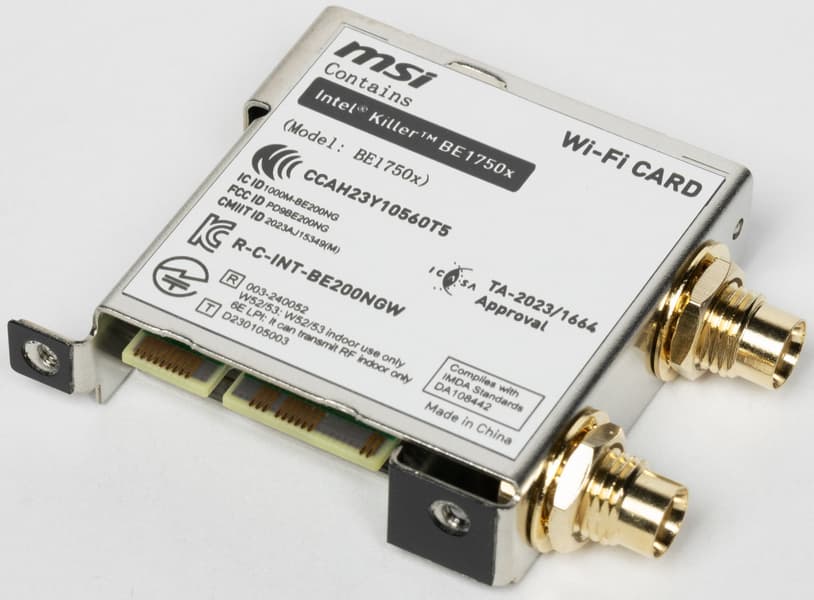 Имеется и комплексный беспроводной адаптер на контроллере Intel BE200, через который реализованы Wi-Fi 7 (802.11a/b/g/n/ac/ax/be, 2,4/5/6 ГГц) и Bluetooth 5.4. Он установлен в слот M.2 (E-key), и его разъемы для выносных антенн выведены на заднюю панель.