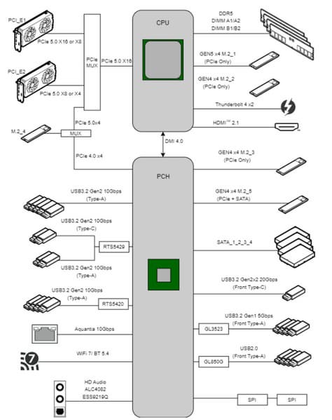 При этом взаимодействие с Z890 идет по особому каналу Digital Media Interface 4.0 (DMI 4.0 x8). Serial Peripheral Interface (SPI) используется для взаимодействия с системой UEFI/BIOS, а шина Low Pin Count (LPC) — для связи с устройствами ввода/вывода, не требующими высокой пропускной способности (контроллерами вентиляторов, TPM, старой периферии). HDA более не используется, связь с аудиокодеками идет с помощью линий USB 2.0.