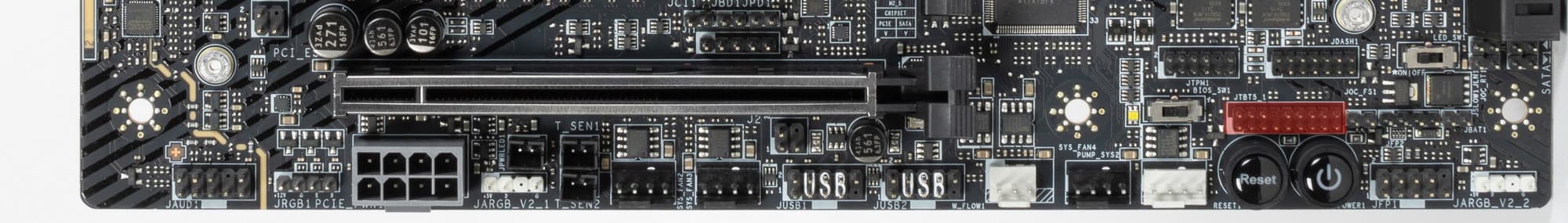 Для питания платы на ней предусмотрены 5 разъемов: в дополнение к 24-контактному ATX (он на правой стороне платы (на фото — слева) здесь есть еще два 8-контактных EPS12V, 6-контактный PCIe (отмечен фиолетовым цветом) для поддержки питания внутреннего USB Type-C (с целью обеспечения быстрой зарядки мобильных гаджетов до 60 Вт через него),а также 8-контактный PCIe для поддержки усиленного питания слотов PCIe x16 (отмечен зеленым цветом).