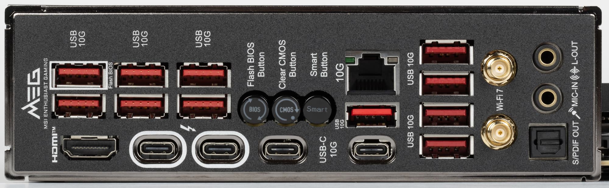 | Разъемы на задней панели | 2 × USB4 (Type-C) 11 × USB 3.2 Gen2 (Type-A) 2 × USB 3.2 Gen2 (Type-C) 1 × RJ-45 2 аудиоразъема типа миниджек 1 × S/PDIF (оптический, выход) 1 × HDMI (выход) 2 антенных разъема многофункциональная кнопка Smart кнопка сброса CMOS кнопка перепрошивки BIOS — Flash BIOS |