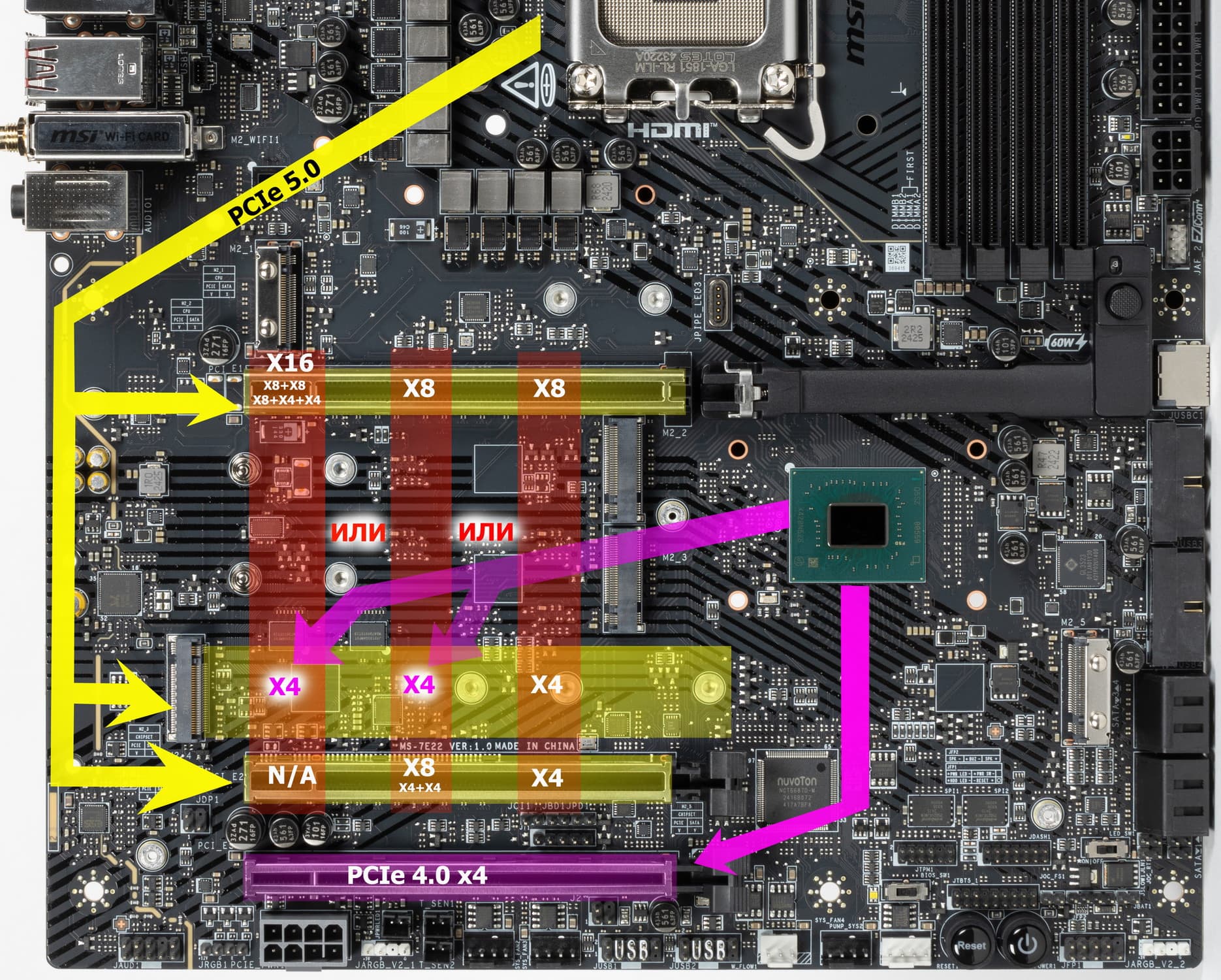 Кроме USB-портов, к которым мы подойдем позже, чипсет Z890 обладает 24 PCIe линиями PCIe 4.0 и 8 SATA портами. Считаем, сколько линий Z890 уходит на поддержку (связь) с тем или иным элементом: