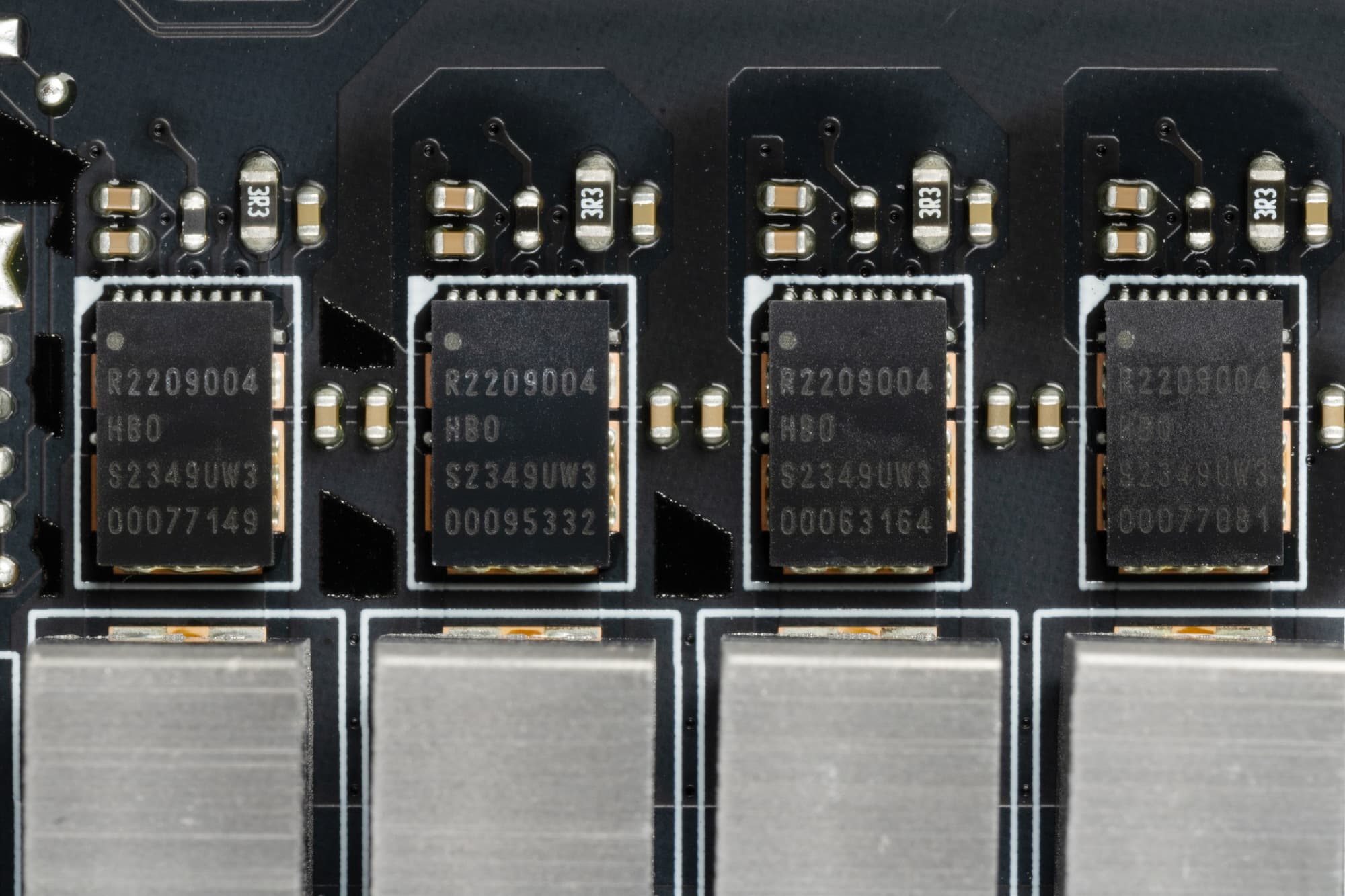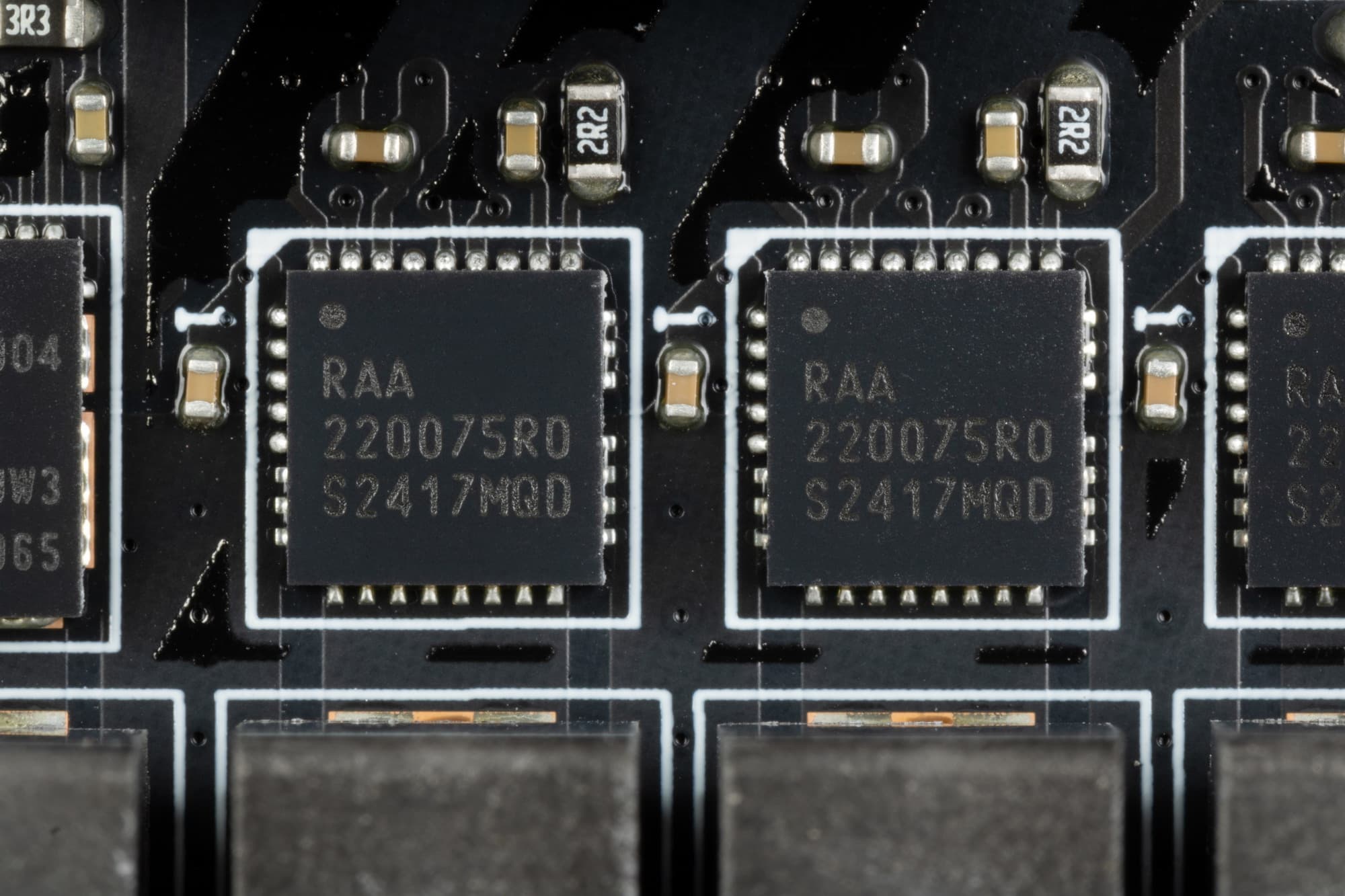 Каждый канал фазы VCore имеет суперферритовый дроссель и R2209004 DrMOS от Renesas на 110 А.
