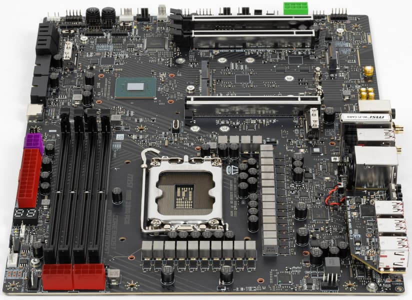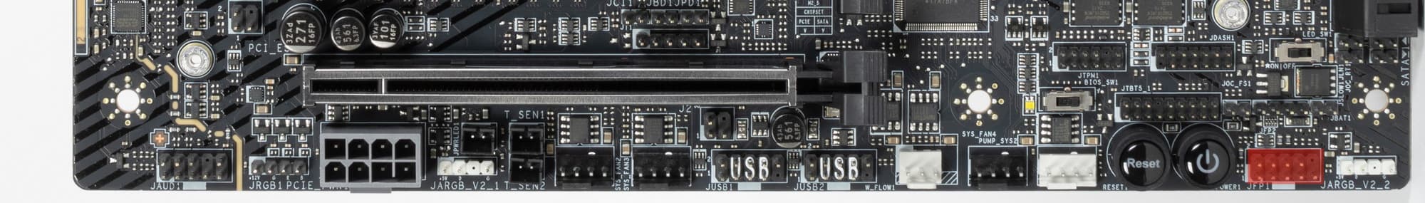 У нее имеется 24 порта USB разных видов, включая 2 USB4, один USB 3.2 Gen2×2 в виде внутреннего порта Type-C и аж 13 портов USB 3.2 Gen2! Также плата предлагает 2 слота PCIe х16, получающих на двоих от процессора 16 линий PCIe 5.0 (и делящих эти линии не только между собой, но и со слотом для накопителей M.2_4), а третий «длинный» слот работает в режиме x4 и подключен к чипсету. У платы 5 слотов M.2, два из которых подключены напрямую к процессору: один — линиями PCIe 4.0, второй — линиями PCIe 5.0. Два других слота М.2 подключены к чипсету Z890 линиями PCIe 4.0, а один M.2_4 настраивается гибко, в зависимости от возможности получать линии PCIe 5.0 от процессора (при этом с ним должны делиться своими линиями слоты PCIe x16) либо от Z890 (тогда уже PCIe 4.0).