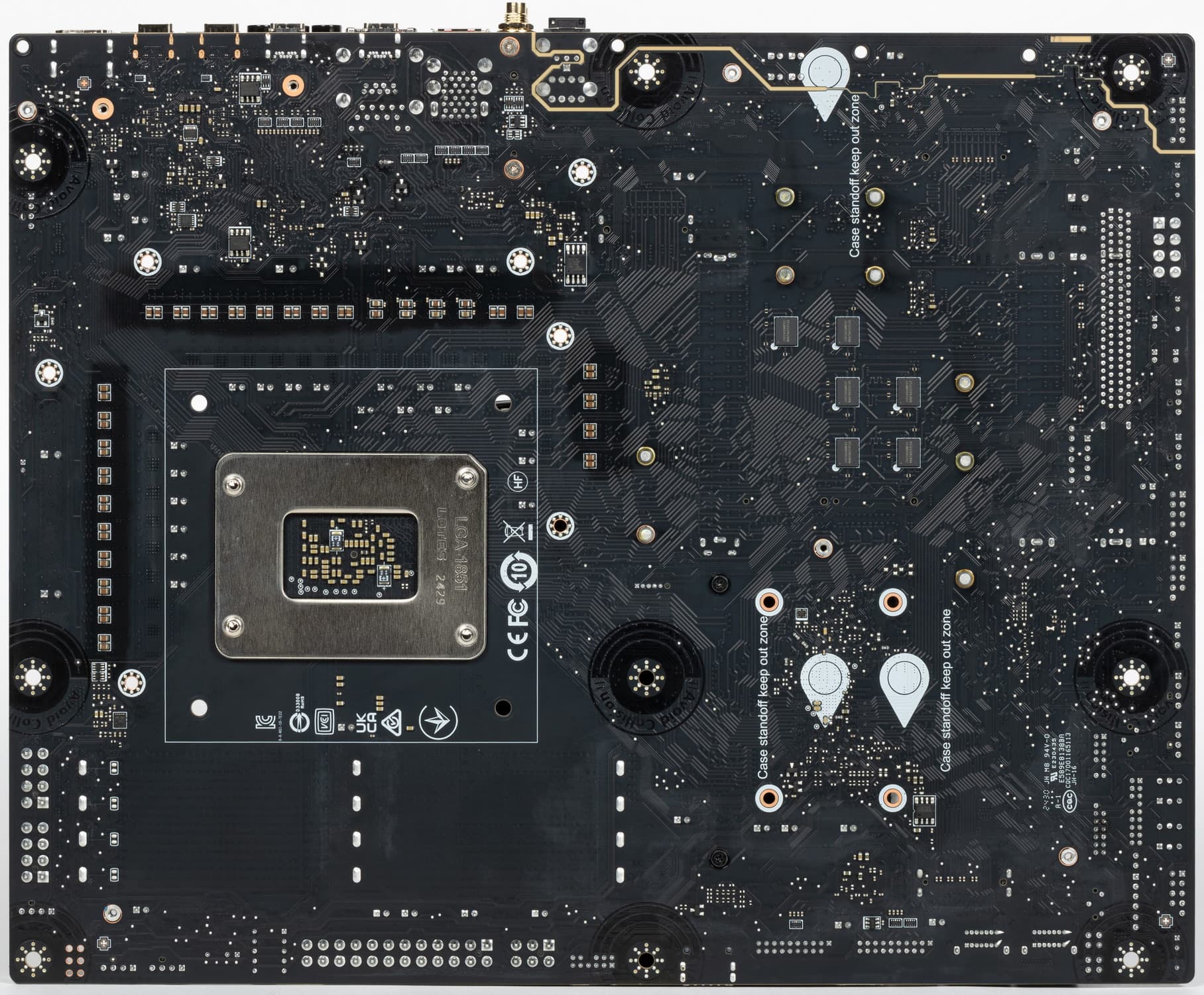 На тыльной стороне платы отмечены места, в которых при установке материнки в корпус могут быть установлены стойки. Однако вся эта информация по сути бесполезна и не нужна, так как у платы имеется защитная пластина (бэкплейт) в антиэлектропроводным покрытием, полностью закрывающая те отмеченные места.