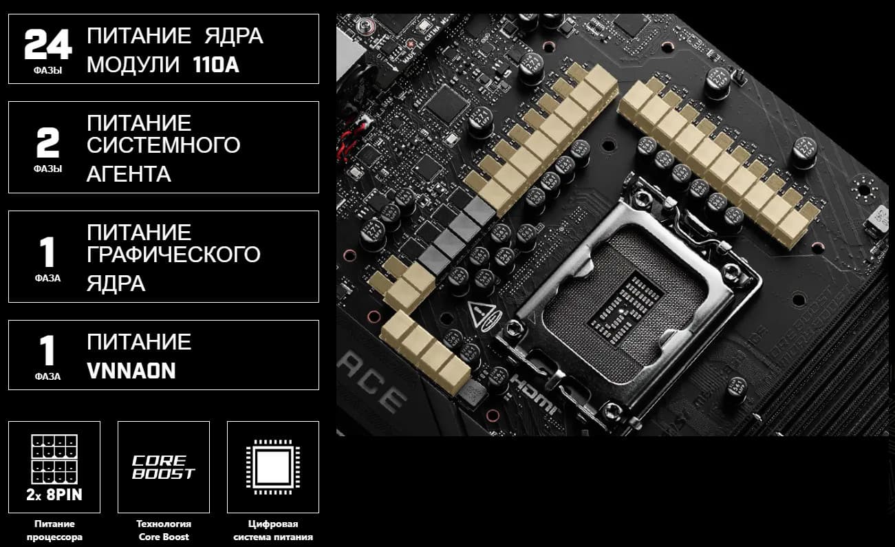 Схема питания процессора выполнена по схеме 24+2+1+1 (всего 28 фаз: 24 на VCore (ядро процессора), 1 на iGPU (интегрированное графическое ядро), 2 на VCCSA (System Agent, кольцевая шина) и 1 на VNNAON (управление энергосбережением).