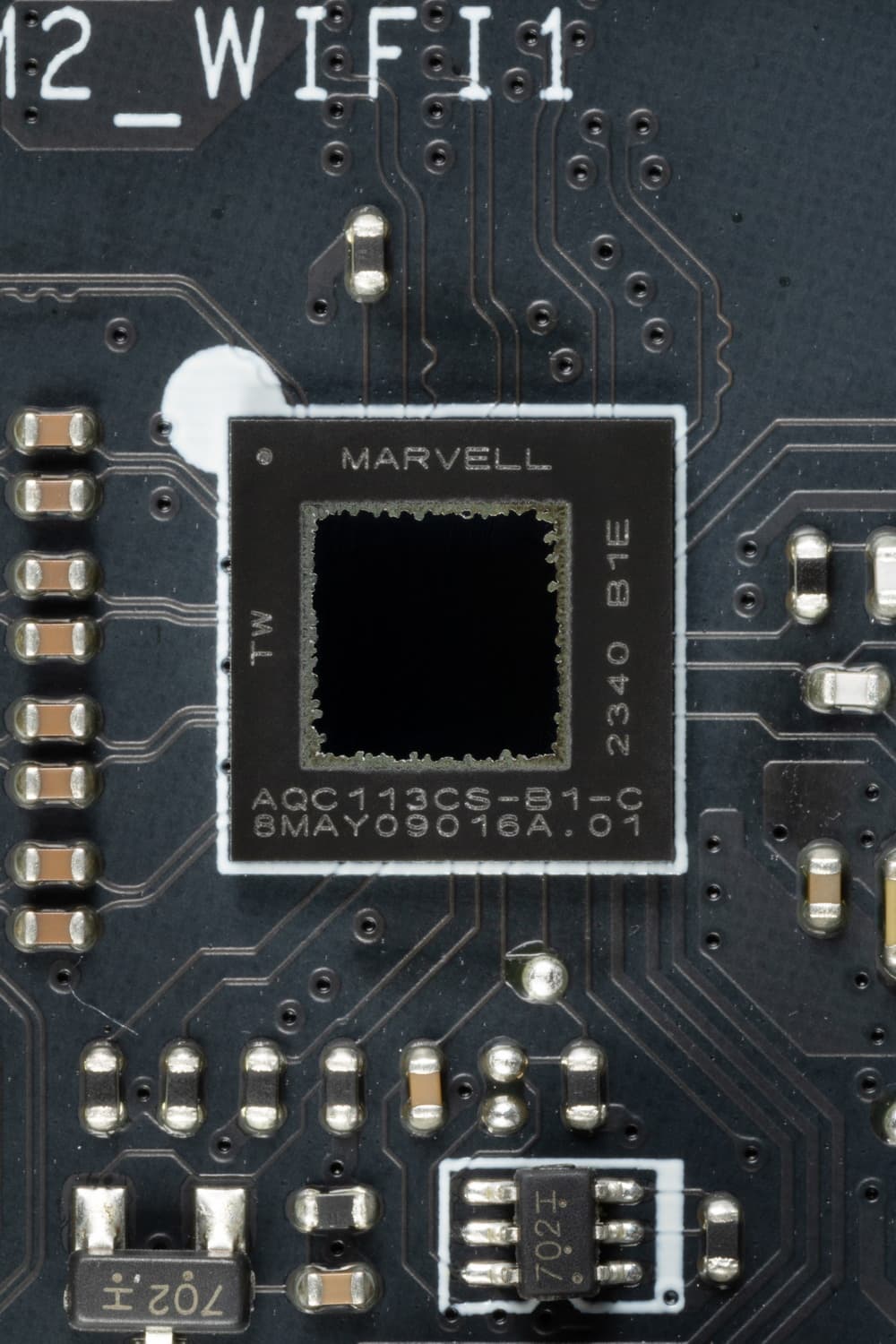 Материнская плата оснащена средствами связи хорошо. Имеется скоростной Ethernet-контроллер Marvel AQC113, способный работать по стандарту 10 Гбит/с.