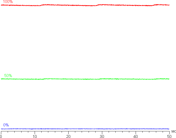 На любом уровне яркости значимая модуляция подсветки отсутствует, поэтому нет и никакого мерцания экрана. В доказательство приведем графики зависимости яркости (вертикальная ось) от времени (горизонтальная ось) при различных значениях настройки яркости: