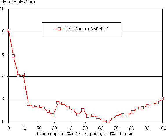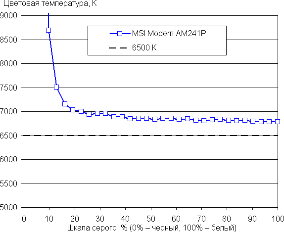 В случае профиля без коррекции (пользовательский профиль с настройками по умолчанию) баланс оттенков на шкале серого хороший, так как цветовая температура достаточна близка к стандартным 6500 К, и отклонение от спектра абсолютно черного тела (ΔE) ниже 3, что для потребительского устройства считается отличным показателем. При этом цветовая температура и ΔE мало изменяются от оттенка к оттенку — это положительно сказывается на визуальной оценке цветового баланса. Поэтому в ручной коррекции особой необходимости нет. (Самые темные области шкалы серого можно не учитывать, так как там баланс цветов не имеет большого значения, да и погрешность измерений цветовых характеристик на низкой яркости большая.)