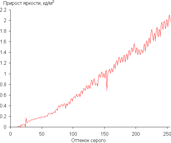 Далее мы измерили яркость 256 оттенков серого (от 0, 0, 0 до 255, 255, 255). График ниже показывает прирост (не абсолютное значение!) яркости между соседними полутонами: