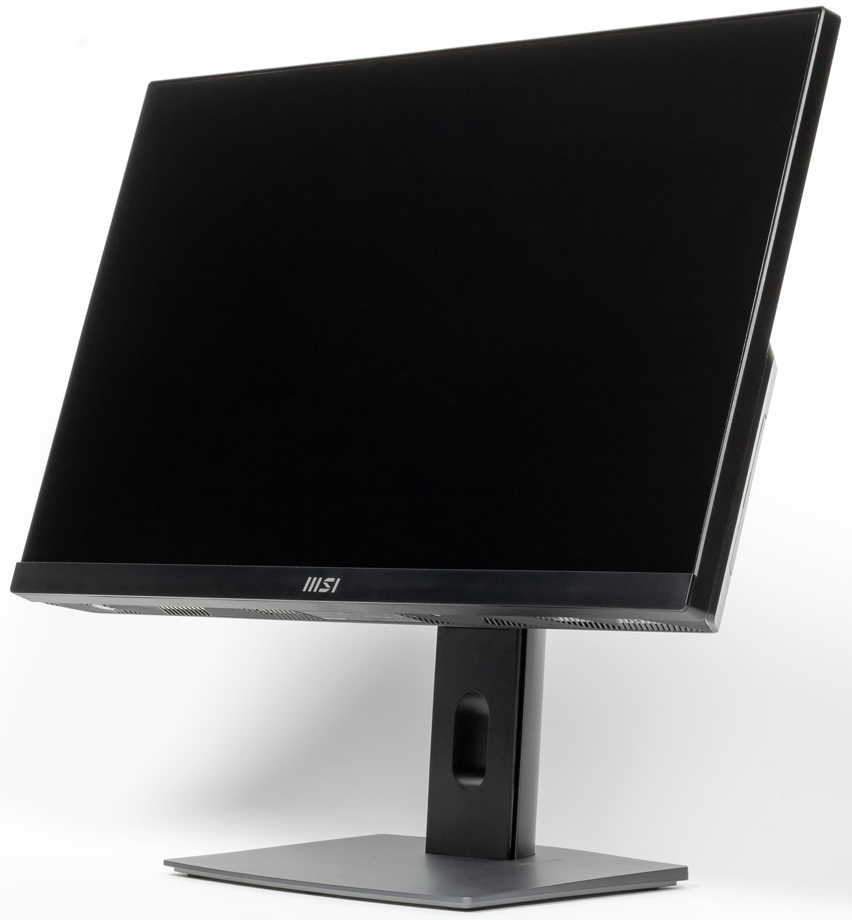 Почему именно эта модель? Логично начать там, где закончили в предыдущий раз. Тем более, что и по дизайну MSI Pro 24X 10M и MSI AM241P 11M, вообще говоря, очень похожи. Во всяком случае, это касается основного блока компьютера — подставка-то теперь совсем другая, с регулировкой по высоте (нижний край экрана перемещается в диапазоне 85—220 мм от поверхности стола). Как и было сказано выше, современный моноблок «двойного назначения» не должен даже в мелочах уступать отдельным мониторам, поскольку теперь он будет конкурировать и с ними. Впрочем, компания по-прежнему использует стандартное VESA-крепление с шагом 75 мм, так что подставки и кронштейны можно использовать любые, но изменение штатной подставки достаточно заметно.