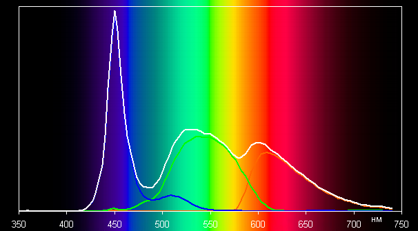 Такой спектр с относительно узким пиком синего и с широкими горбами зеленого и красного цветов характерен для экранов, в которых используется белая светодиодная подсветка с синим излучателем и желтым люминофором.