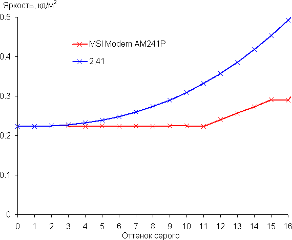 На большей части шкалы серого рост прироста яркости довольно равномерный. Однако в самой темной области первые 11 оттенков по яркости не отличаются от черного цвета: