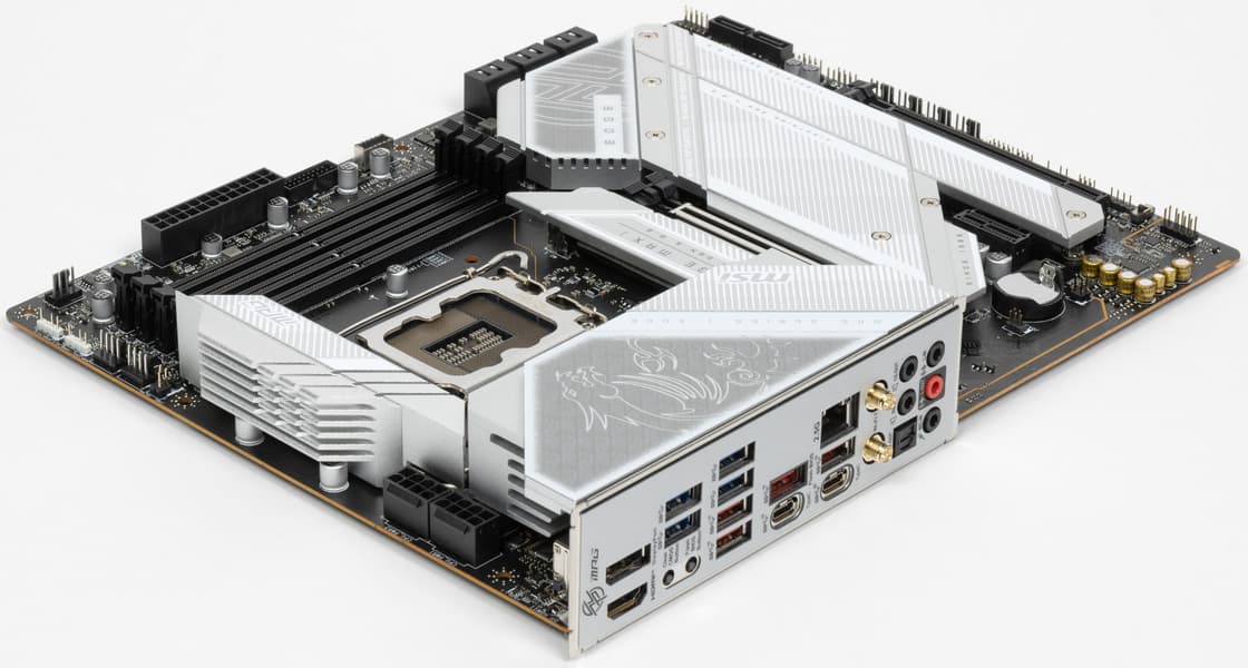 Еще у этой модели 8 портов SATA и 8 разъемов для вентиляторов. Плата относится к серии MPG, одной из флагманских, так что система питания процессора у нее очень мощная, она способна обеспечить работу любых совместимых процессоров с приличным запасом на разгон (хотя в схеме используются удвоители фаз питания). Также мы видим очень грамотную систему охлаждения каждого потенциально греющегося элемента, включая накопители в слотах M.2. Сетевые возможности хорошие: быстрый проводной контроллер 2,5 Гбит/с, а также самый современный беспроводной с поддержкой Wi-Fi 7 и Bluetooth 5.4. В числе плюсов платы можно упомянуть широкие возможности для подключения RGB-устройств подсветки, а также дизайн с приятной подсветкой.