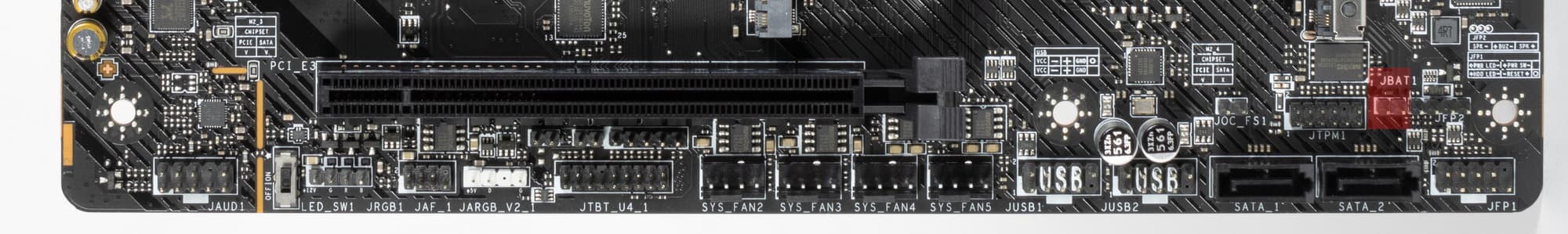Всего на плате есть 3 слота: слот PCIe x16_1 (PCI_E1) (для видеокарт или других устройств), слот PCIe x16_2 (PCI_E3, фактически имеющий 4 линии) и один PCIe_x1 (PCI_E2). Если про первый PCIe x16 я выше уже рассказал (он подключен к CPU), то PCIe x16_2 подключен к Z790 и работает в режиме х4.