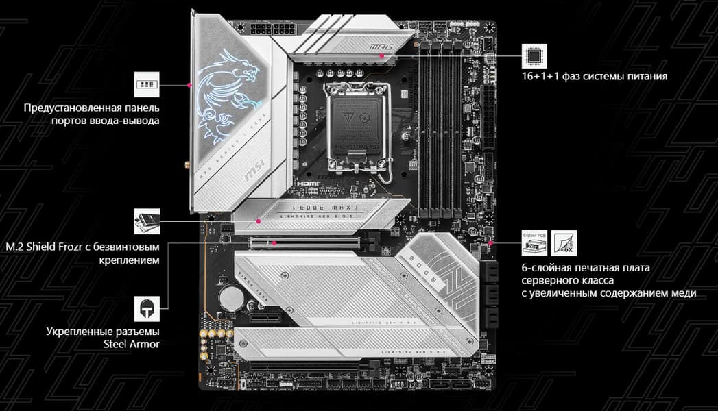 Материнская плата MSI MPG Z790 Edge Ti Max WiFi — представитель почти флагманской серии MPG с примерной стоимостью в районе 50 тысяч рублей.