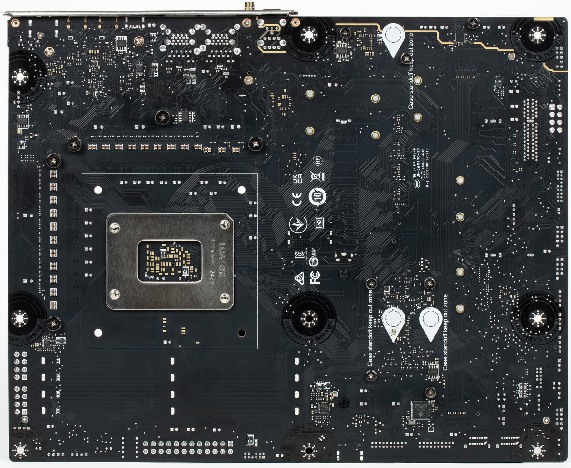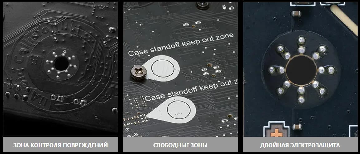 На тыльной стороне платы отмечены места, в которых при установке материнки в корпус могут быть установлены стойки, чтобы перед монтажом сборщик мог внимательно проверить минимальное количество нужных стоек. А также вокруг крепежных отверстий имеются зоны, подверженные потенциальному повреждению при неудачной установки платы в корпус, но при этом это не скажется на работоспособности матплаты.