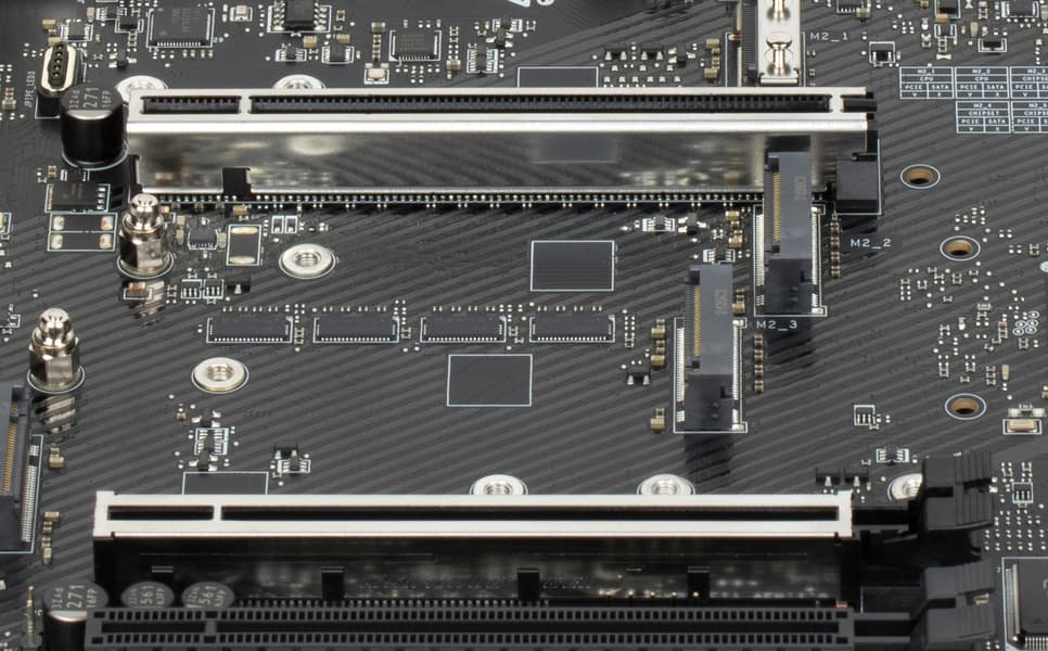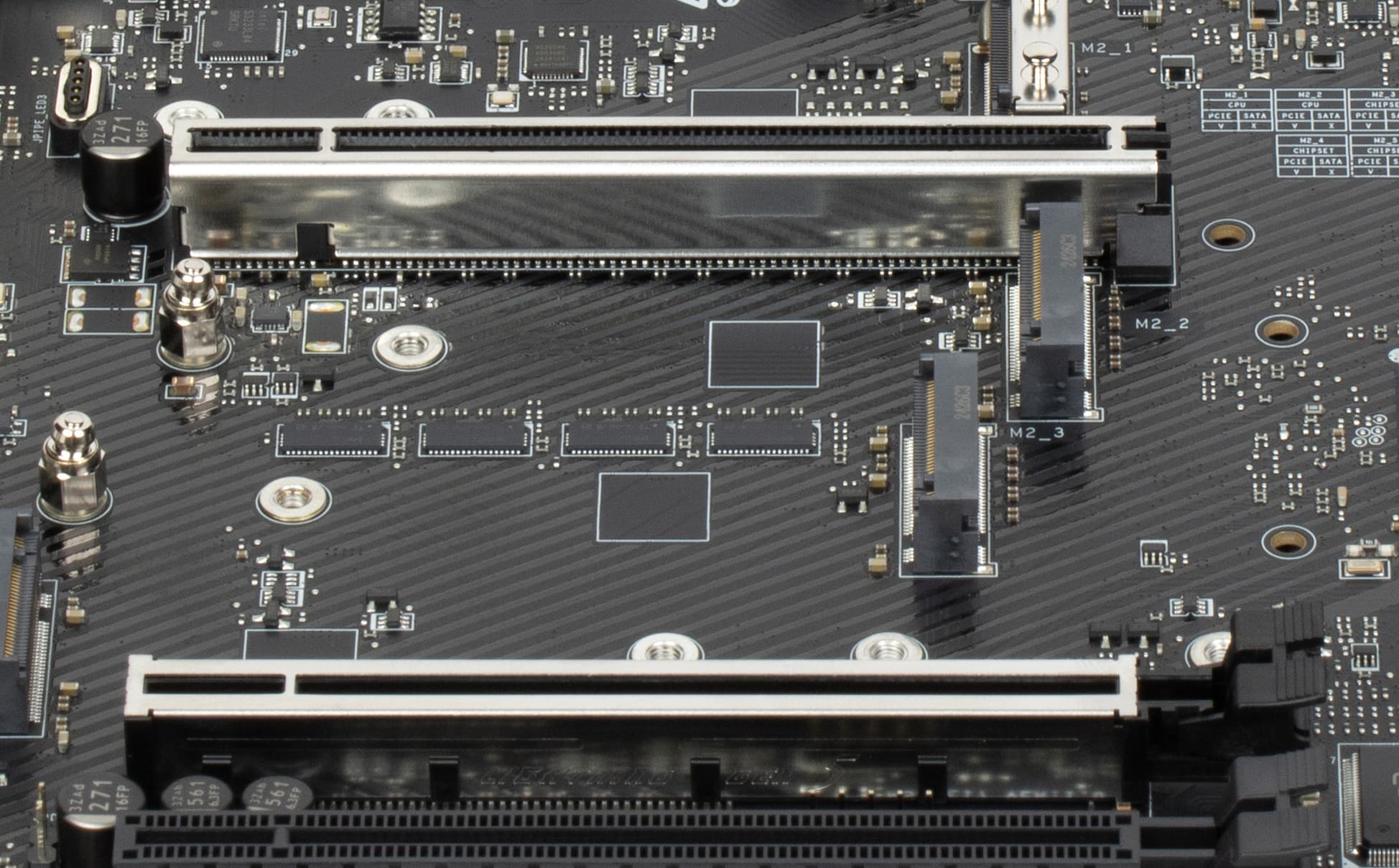 Всего на плате есть 3 слота: два PCIe x16 (PCI_E1/2 для видеокарт или других устройств) и третий «длинный» PCIe x16 (PCI_E3, но фактически имеющий 4 линии PCIe 4.0).