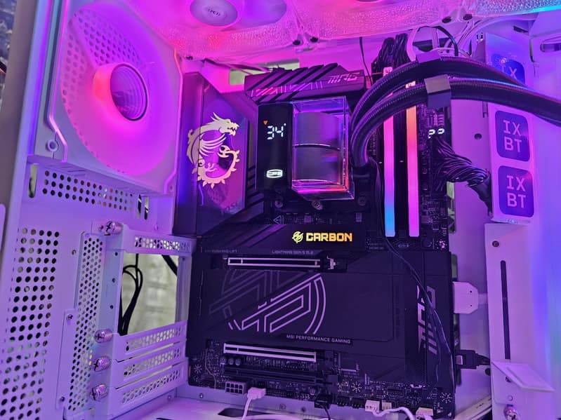 MSI MPG Z890 Carbon WiFi — очень мощная по системе питания, насыщенная всевозможными слотами и разъемами и, разумеется, недешевая материнская плата на базе последнего чипсета Intel Z890. Это не совсем флагман, ее стоимость на момент подготовки обзора составляла около 80 тысяч рублей.