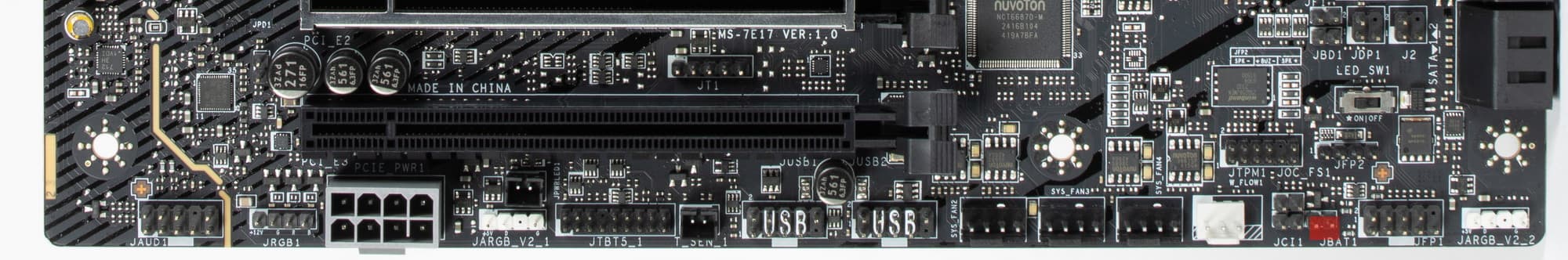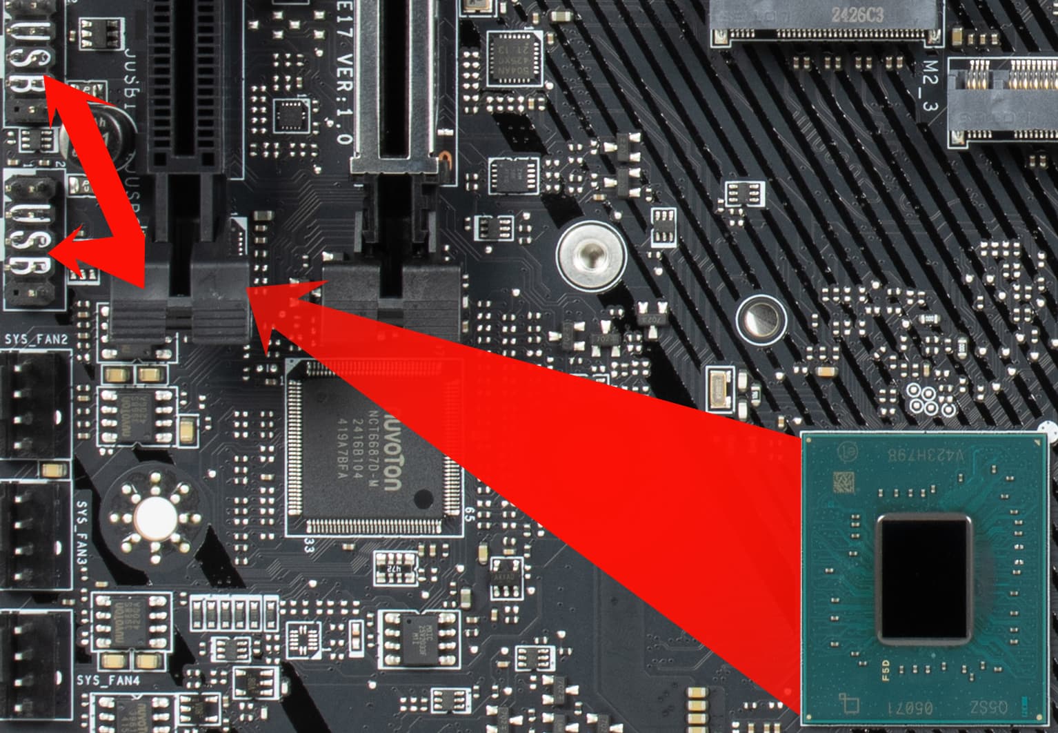 - 4 порта USB 2.0/1.1: все реализованы через контроллер Genesys Logic GL850G (он расположен под слотом PCIe E3, поэтому его не видно, на него потрачена 1 линия USB 2.0 от Z890) и представлены двумя внутренними разъемами (каждый на 2 порта)
