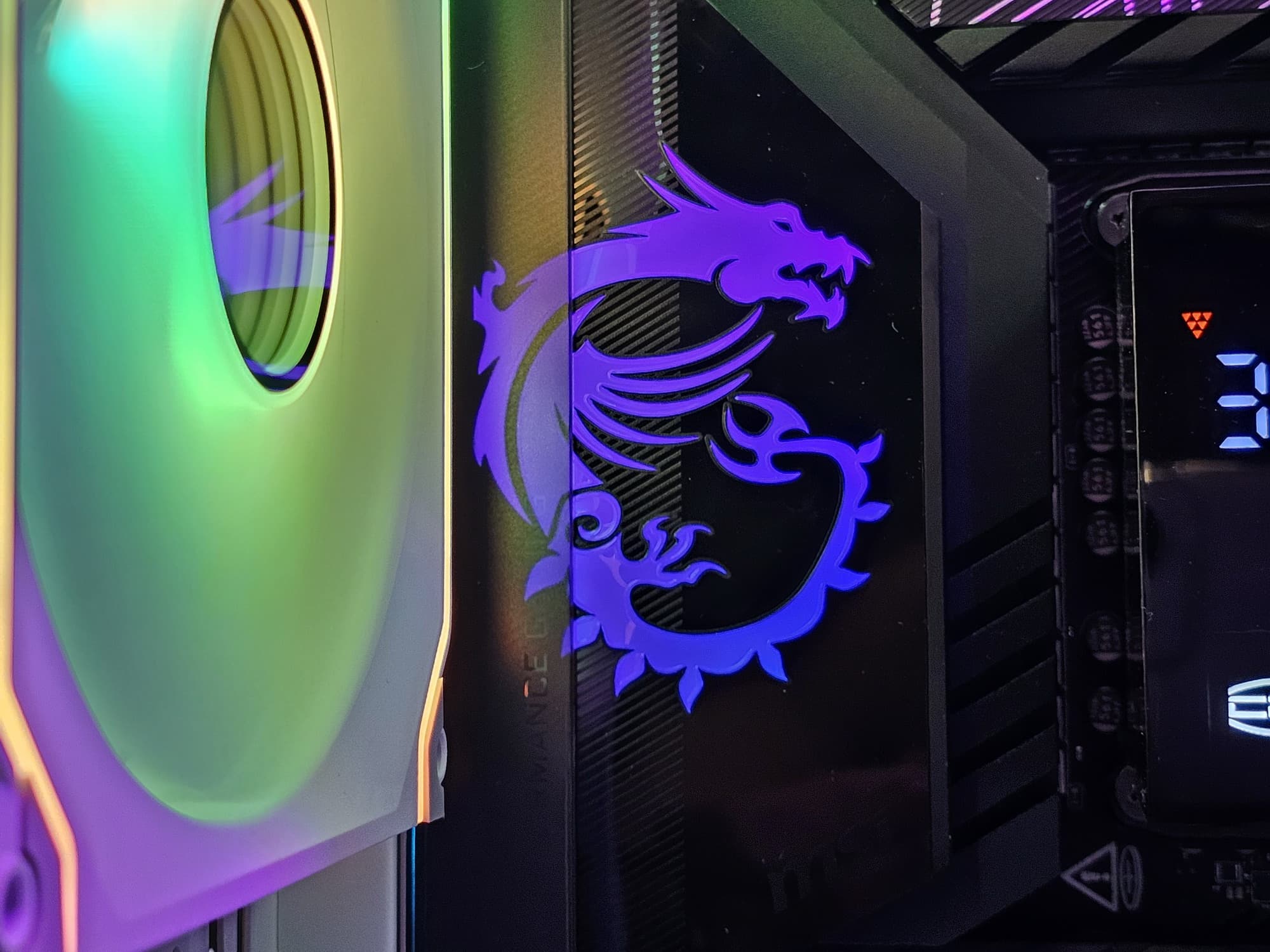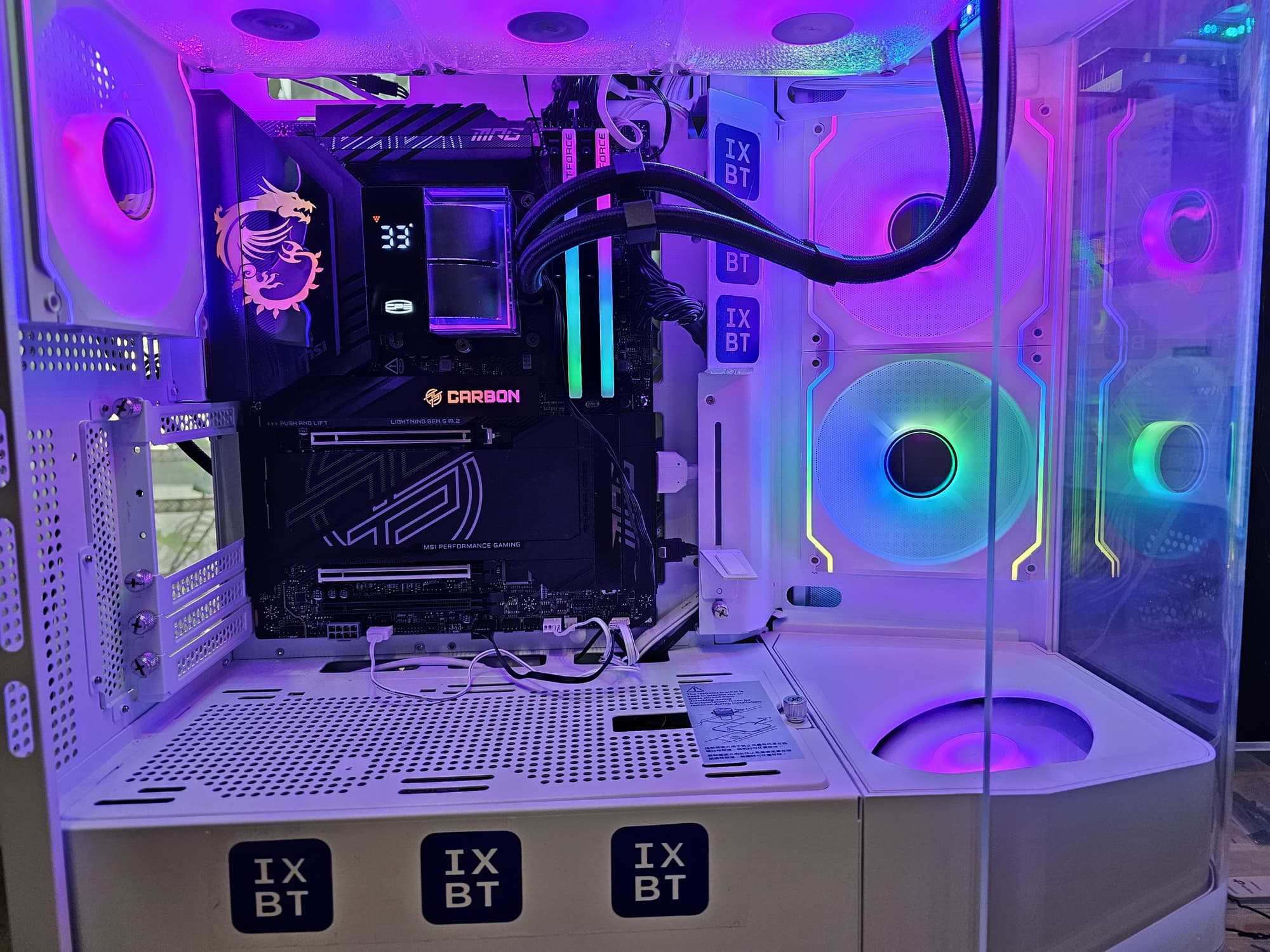 В арсенале платы также есть 4 порта SATA и 7 разъемов для вентиляторов. Система питания процессора очень мощная, способная обеспечить работу любых совместимых процессоров с приличным запасом на разгон. Плата имеет грамотную систему охлаждения каждого потенциально греющегося элемента, включая накопители в слотах M.2 (термопрокладки для охлаждения накопителей есть с обеих сторон). Сетевые возможности включают два проводных контроллера (5 и 2,5 Гбит/с) и один самый современный беспроводной — Wi-Fi 7 + Bluetooth 5.4. В числе плюсов платы можно упомянуть неплохую стильную подсветку, а также широкие возможности для подключения дополнительных RGB-устройств.