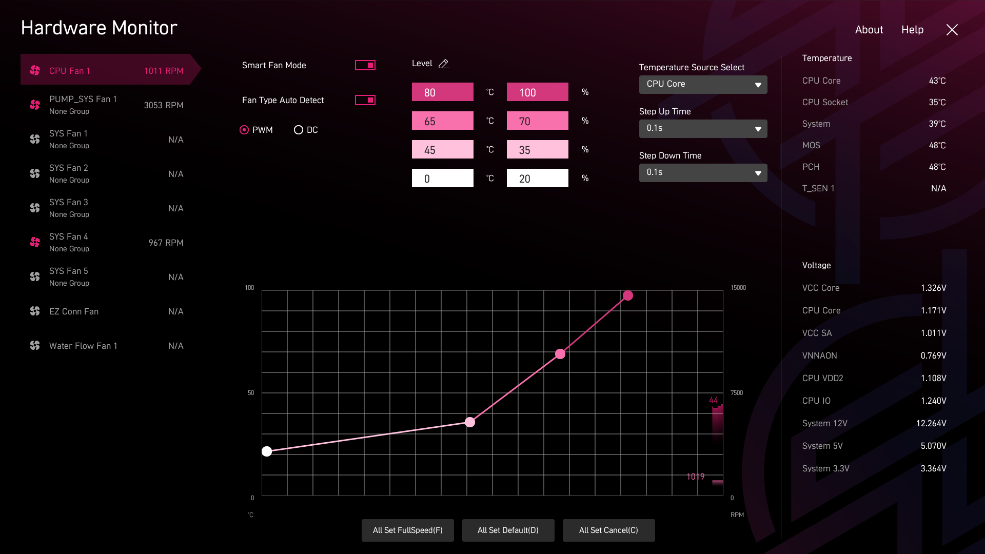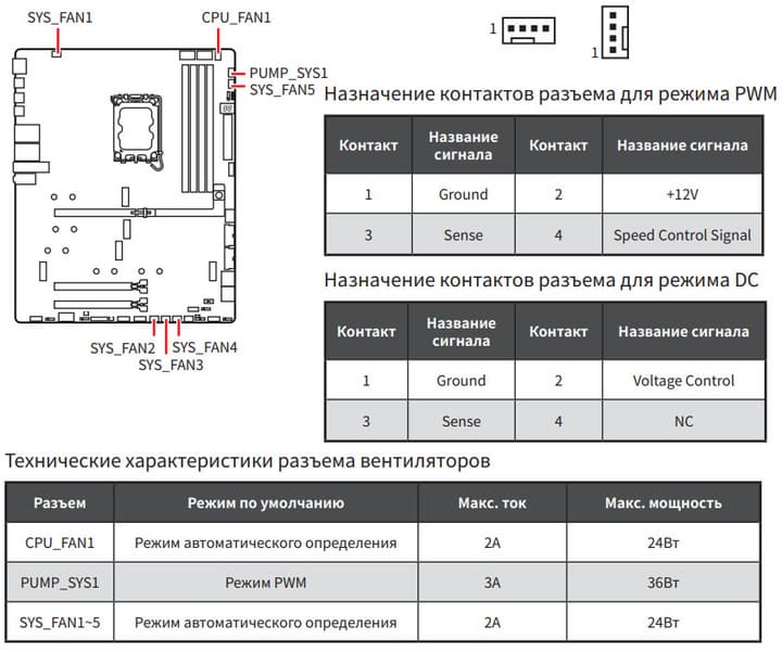 Через ПО или BIOS контролируется все гнезда для подключения воздушных вентиляторов или помп: они могут управляться как через ШИМ, так и банальным изменением напряжения/тока расчитаны на максимальный ток 2А и потребление до 24 Вт, а одно гнездо для помпы кастомной СЖО – до 3А и 36 Вт.