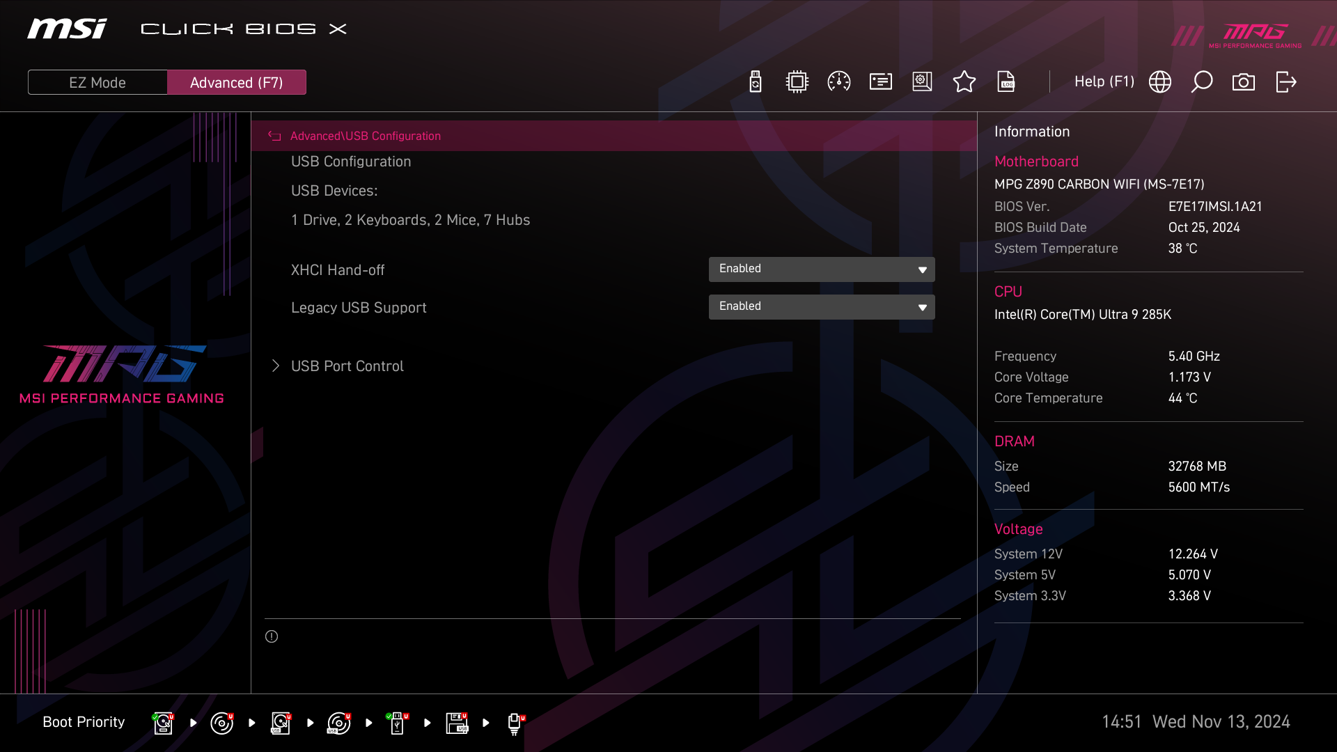 | USB-порты | 4 × USB 2.0: 2 внутренних разъема на 4 порта (GL850G) 4 × USB 3.2 Gen1: 2 внутренних разъема на 4 порта (GL3523) 10 × USB 3.2 Gen2: 10 порта Type-A (красные) (2×RTS5420+Z890) 1 × USB 3.2 Gen2: 1 порт Type-C (Z890) 1 × USB 3.2 Gen2x2: внутренний разъем Type-C (Z890) 2 × USB4: 2 порта Type-C (CPU, Thunderbolt4) |